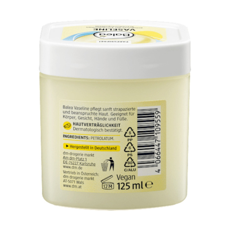وازلین بدون عطر Balea واقعاً یک وسیله ضروری در هر خانهای است. این وازلین که در یک ظرف نگهداری کاربردی عرضه میشود، برای پوستهای آسیبدیده و تحت فشار ایدهآل است. پوست را تغذیه میکند و حس نرمی دلپذیری به آن میدهد. همچنین برای استفاده روی بدن، صورت، دستها و پاها ایدهآل است. سازگاری آن با پوست از نظر پوستی تأیید شده است.