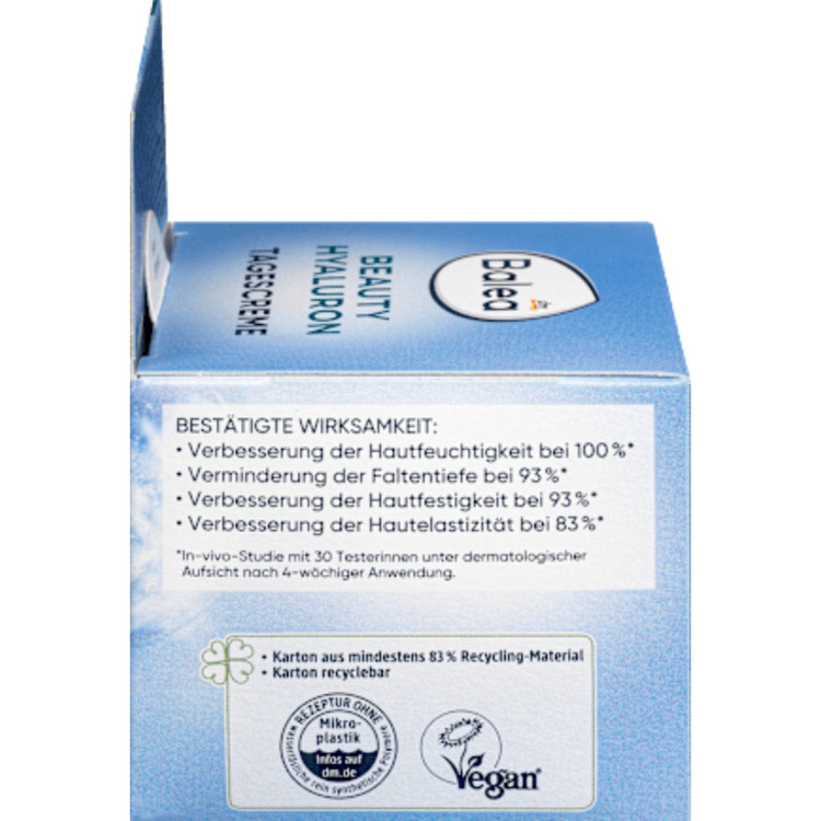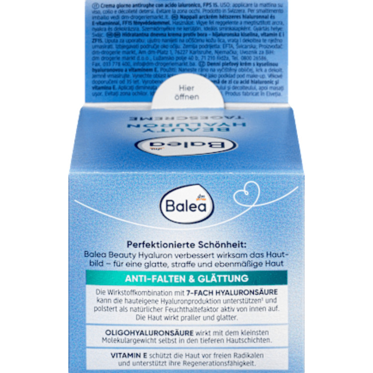 کرم روز هیالورون Balea Beauty با SPF 15 با 7 برابر اسید هیالورونیک، خاصیت حجم دهندگی دارد و پوست را به طرز دلپذیری نرم میکند. با استفاده منظم، رنگ چهره بهبود مییابد و خطوط ریز کاهش مییابند. به لطف اسید الیگوهیالورونیک موجود در آن، کرم روز حتی در لایههای عمیقتر پوست نیز عمل میکند. ویتامین E به محافظت از پوست در برابر رادیکالهای آزاد کمک میکند و توانایی آن را در بازسازی افزایش میدهد. این کرم صورت با SPF 15 همچنین میتواند با پیری زودرس پوست ناشی از نور مقابله کند.