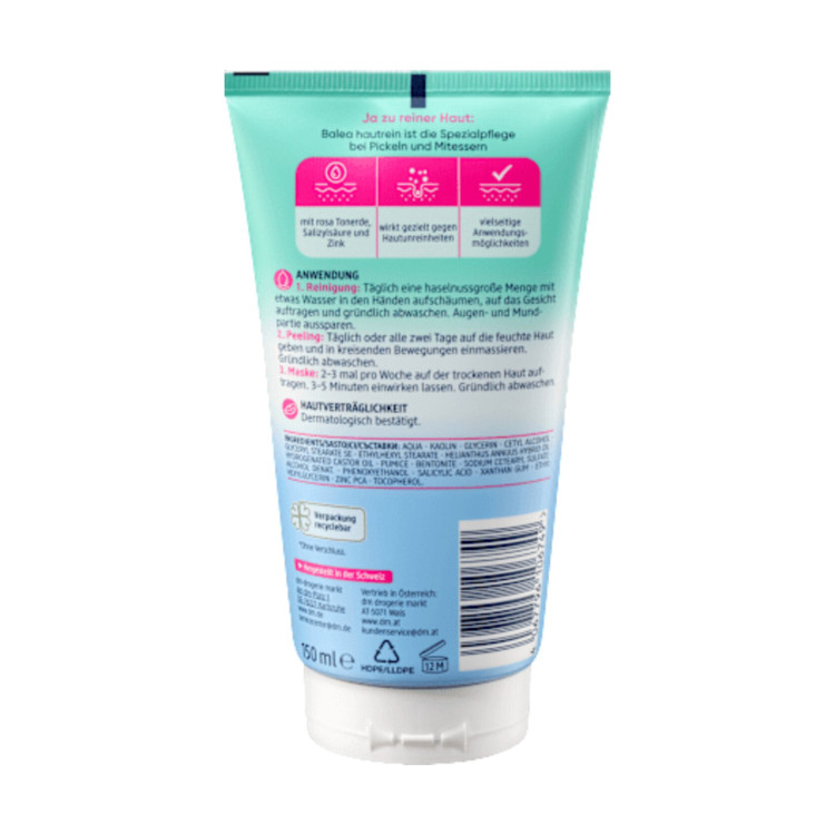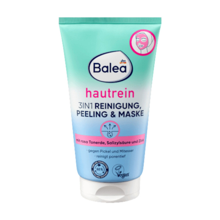 پاککننده صورت سه در یک Balea Pure Skin ترکیبی از یک پاککننده سریع، لایهبردار و ماسک در یک محصول است. این محصول غنیشده با خاک رس صورتی، اسید سالیسیلیک و روی، منافذ پوست را عمیقاً تمیز میکند. Balea پاکسازی عمیق و دلپذیری را روزانه ارائه میدهد. این فرمول عاری از میکروپلاستیک و پلیمرهای کاملاً مصنوعی محلول در آب است.