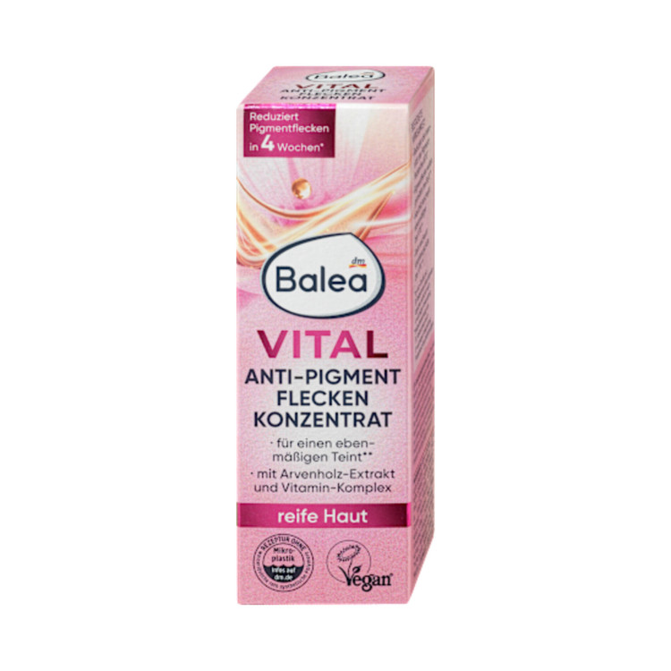 با کنسانتره ضد لک Vital ضد لک Balea، چهرهای یکدستتر داشته باشید. فرمول گیاهی این محصول با عصاره چوب کاج و یک کمپلکس ویتامین غنی شده است. Pinolumin™، عصاره غلیظ چوب کاج، میتواند شدت لکههای رنگدانهای و ناهمواریها را به طور قابل توجهی کاهش دهد. شدت رنگ لکهها نیز میتواند نرم و روشنتر شود. کمپلکس ویتامینهای E، B3 و B5 رطوبت زیادی به پوست میدهد و از آن در برابر رادیکالهای آزاد محافظت میکند. این کنسانتره همچنین میتواند علائم پیری پوست را خنثی کرده و چین و چروک را کاهش دهد.