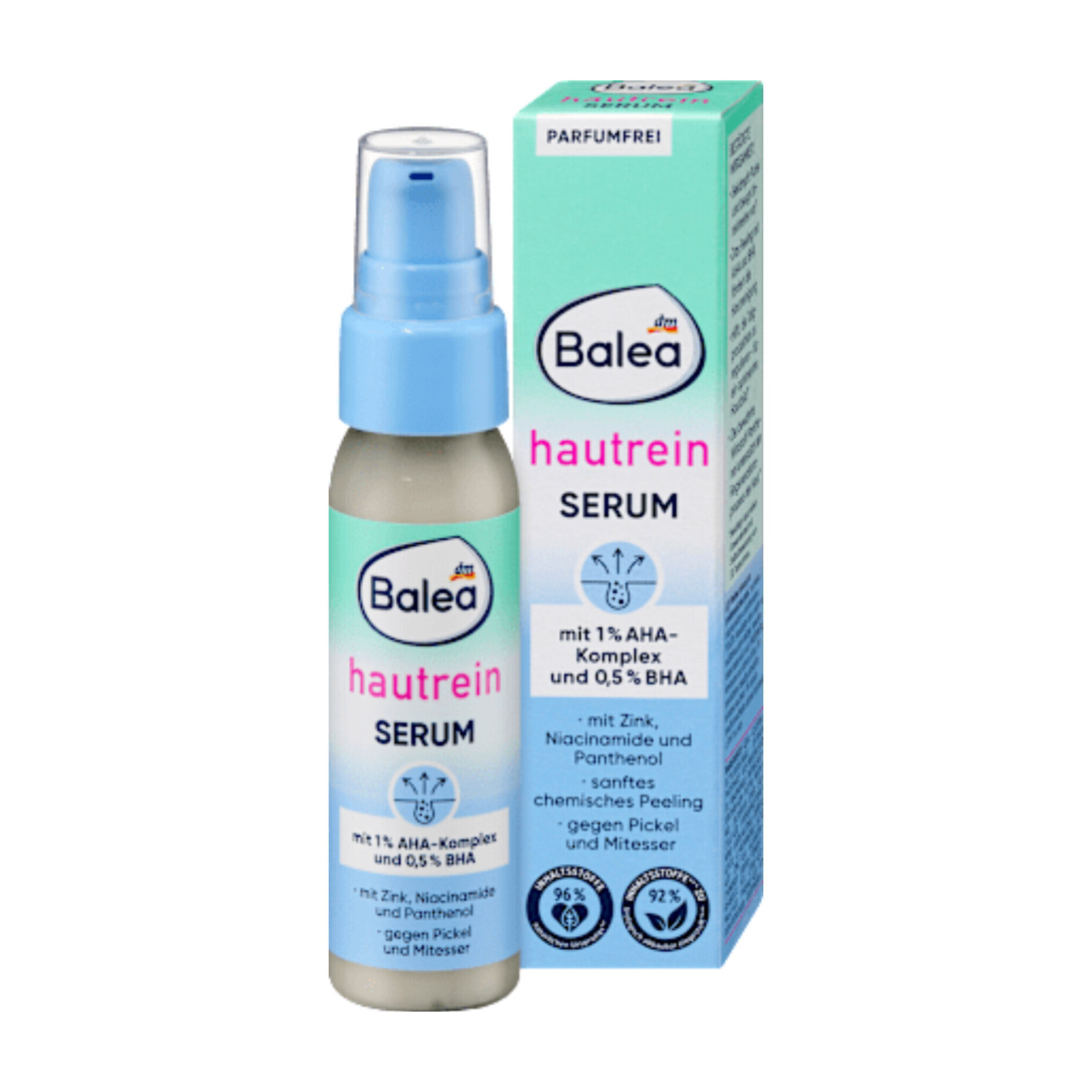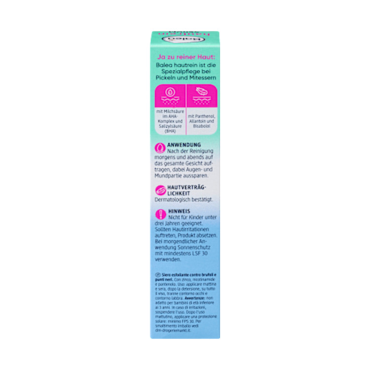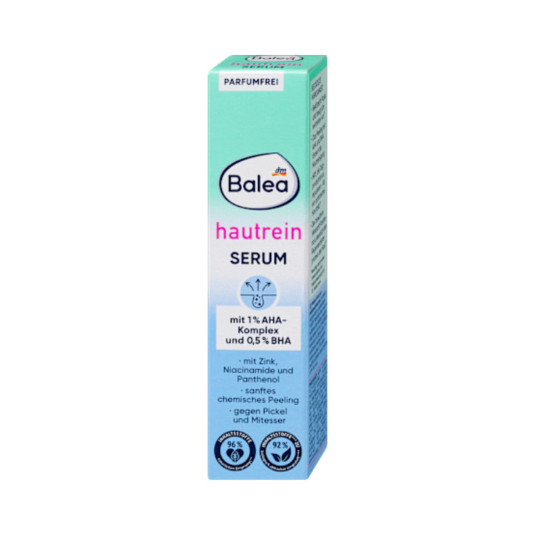سرم پوست خالص Balea یک خط ویژه برای پوستهای چرب است. اسید لاکتیک (در کمپلکس AHA) و اسید سالیسیلیک (BHA) به عنوان یک لایه بردار شیمیایی عمل میکنند و سلولهای مرده پوست را به آرامی از بین میبرند. فرمول حاوی نیاسینامید و روی میتواند کاهش تولید سبوم خود پوست را کاهش دهد. Balea که بدون میکروپلاستیک و پلیمرهای کاملاً مصنوعی محلول در آب فرموله شده است، پوستی درخشان، زیبا و مراقبت شده را تضمین میکند.