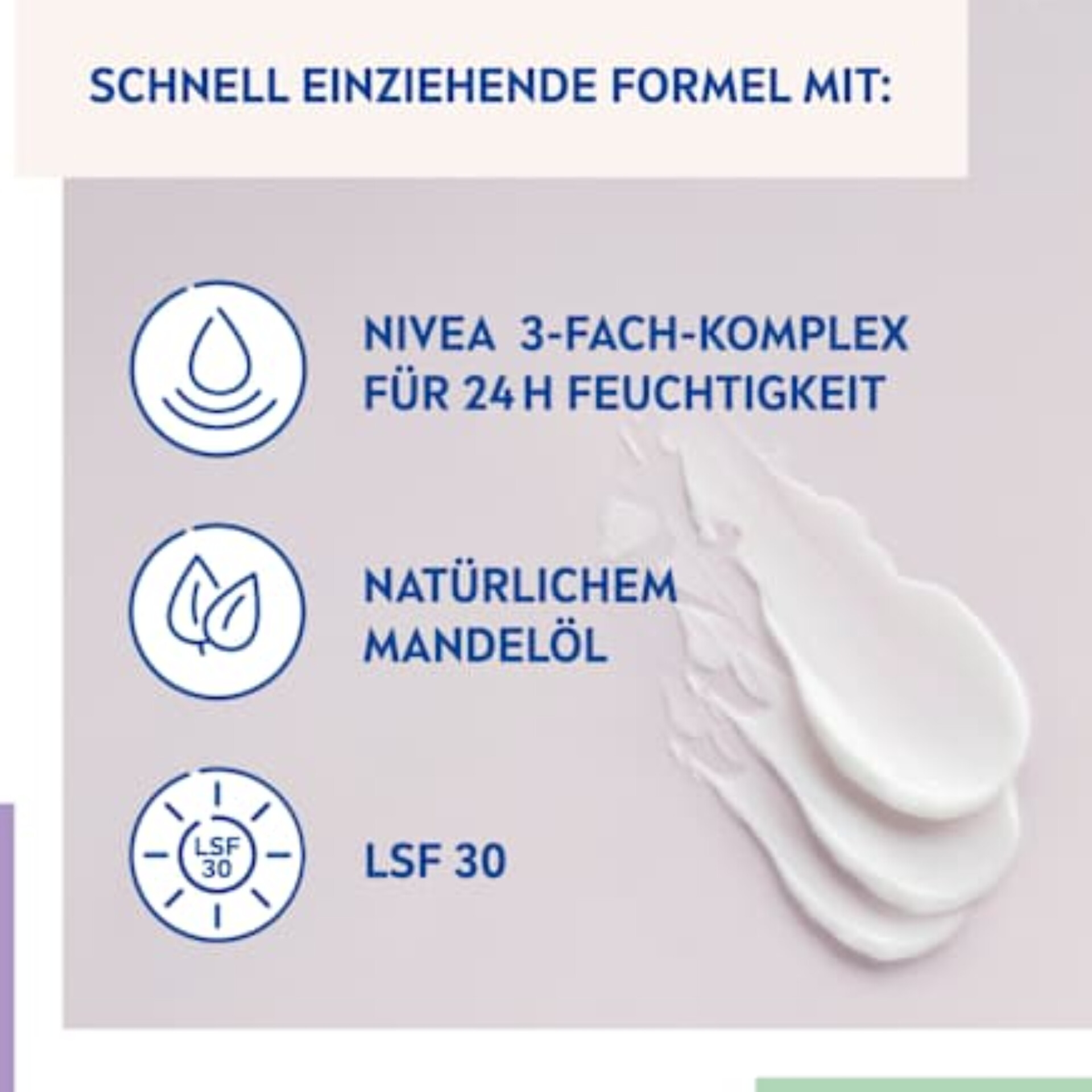 با کرم روز غنی نیوآ از پیری زودرس پوست ناشی از نور خورشید جلوگیری کنید! این کرم که با روغن بادام طبیعی فرموله شده است، حاوی SPF 30 نیز میباشد. این کرم محافظت روزانه در برابر اثرات مضر محیطی، از جمله اشعههای مضر UV، را فراهم میکند. این کرم روز همچنین سطح رطوبت طبیعی پوست را متعادل میکند و تا 24 ساعت آبرسانی عمیق را فراهم میکند - مناسب برای پوست خشک! همچنین به سرعت جذب میشود و پوست شما را نرم و لطیف میکند. این به شما امکان میدهد زیبایی طبیعی و بینقص خود را آشکار کنید!