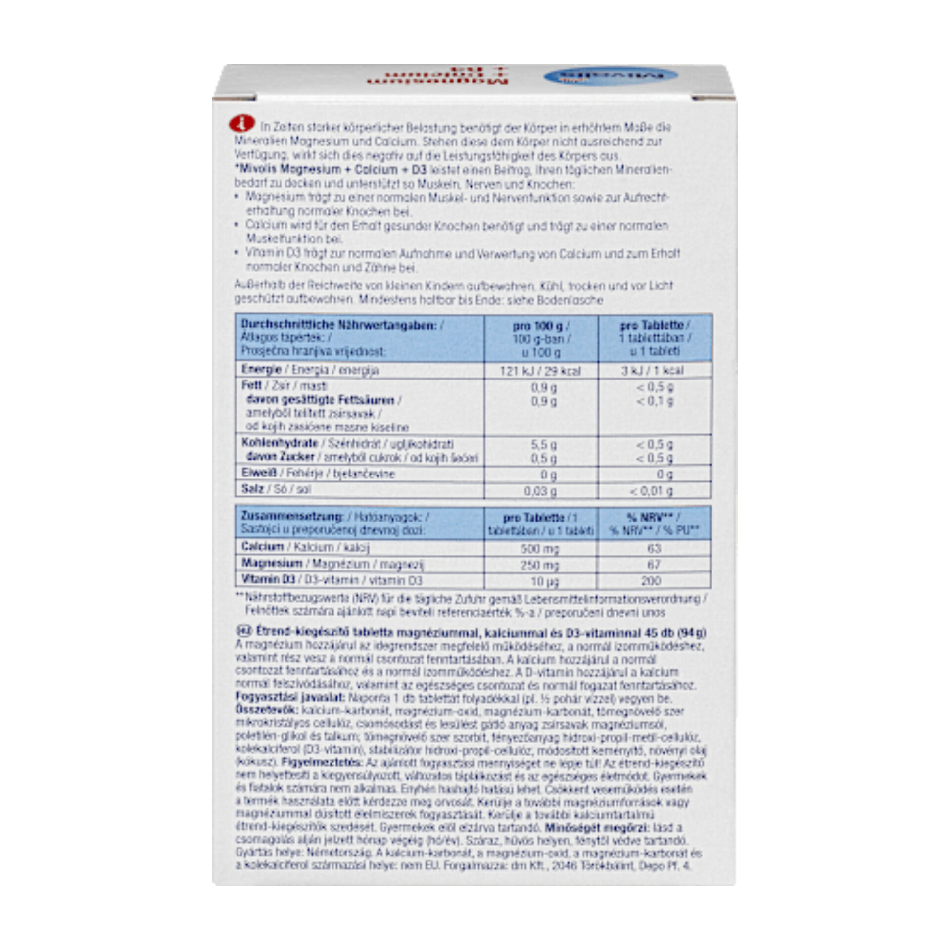 مواد مغذی ارزشمند برای عملکرد طبیعی بدن: قرصهای میوولیس منیزیم + کلسیم + D3 ترکیبی از سه ماده مغذی ضروری برای بدن انسان هستند و میتوانند از عملکرد عضلات و سلامت استخوانها پشتیبانی کنند. منیزیم و کلسیم به عملکرد طبیعی عضلات و اعصاب و همچنین حفظ سلامت استخوانها کمک میکنند. ویتامین D3 موجود در آنها میتواند به جذب و استفاده طبیعی کلسیم کمک کند و به حفظ سلامت استخوانها و دندانها کمک کند. به لطف خط شکستگی، دوز مصرفی این قرصها آسان است. در دورههای افزایش فشار بدنی ایدهآل است.