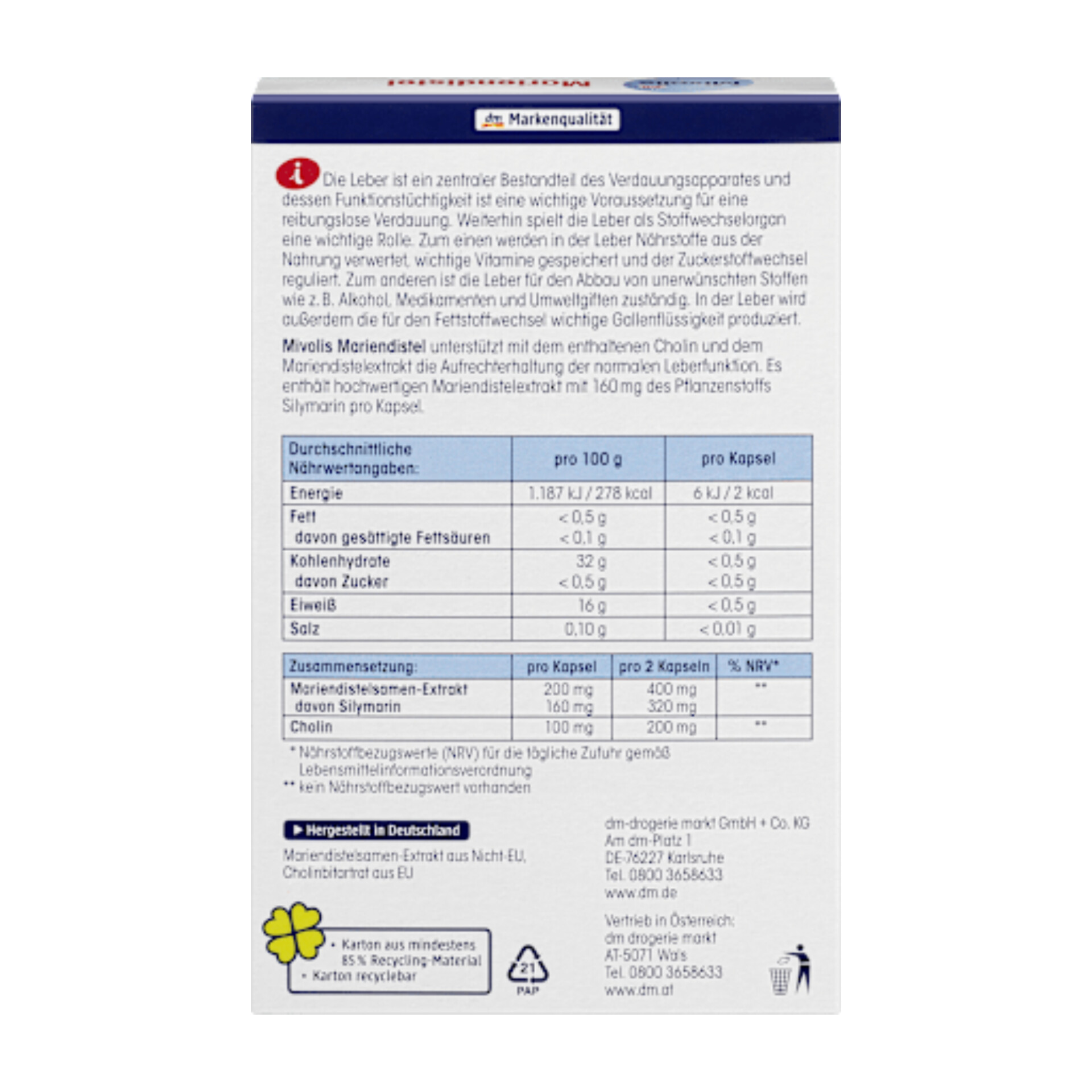 کبد بخش مهمی از دستگاه گوارش است و کپسولهای خار مریم میوولیس میتوانند به طور ایدهآل از آن پشتیبانی کنند. این کپسولها برای مصرف روزانه مناسب هستند و باید با آب فراوان مصرف شوند. مکمل غذایی میوولیس حاوی کولین است که میتواند به حفظ عملکرد طبیعی کبد کمک کند.