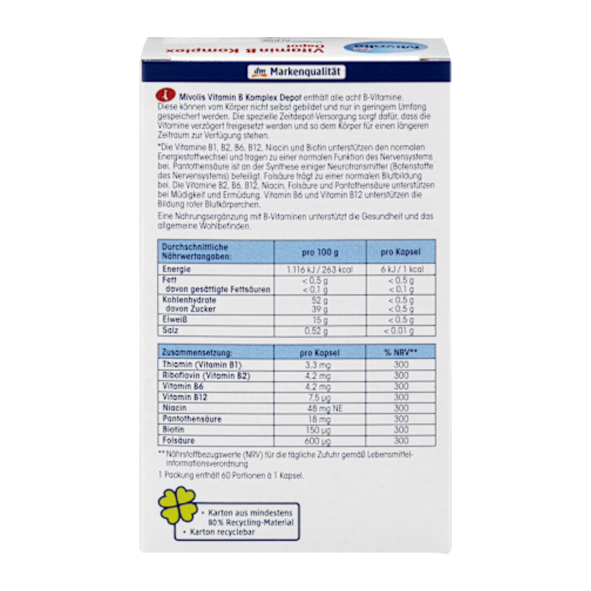 کمپلکس ویتامین B میوولیس: برای اعصاب و انرژی. این شیافهای کوچک حاوی هر هشت ویتامین B هستند که بدن نمیتواند آنها را تولید کند و فقط میتواند در مقادیر کم ذخیره کند. به لطف فناوری ویژه دپو، کپسولها مواد فعال خود را به تدریج در بدن آزاد میکنند و در نتیجه مزایای طولانیتری را ارائه میدهند. آنها میتوانند از سلامت عمومی و تندرستی پشتیبانی کنند. علاوه بر این، ویتامینها میتوانند به عملکرد طبیعی متابولیسم انرژی و سیستم عصبی کمک کنند.