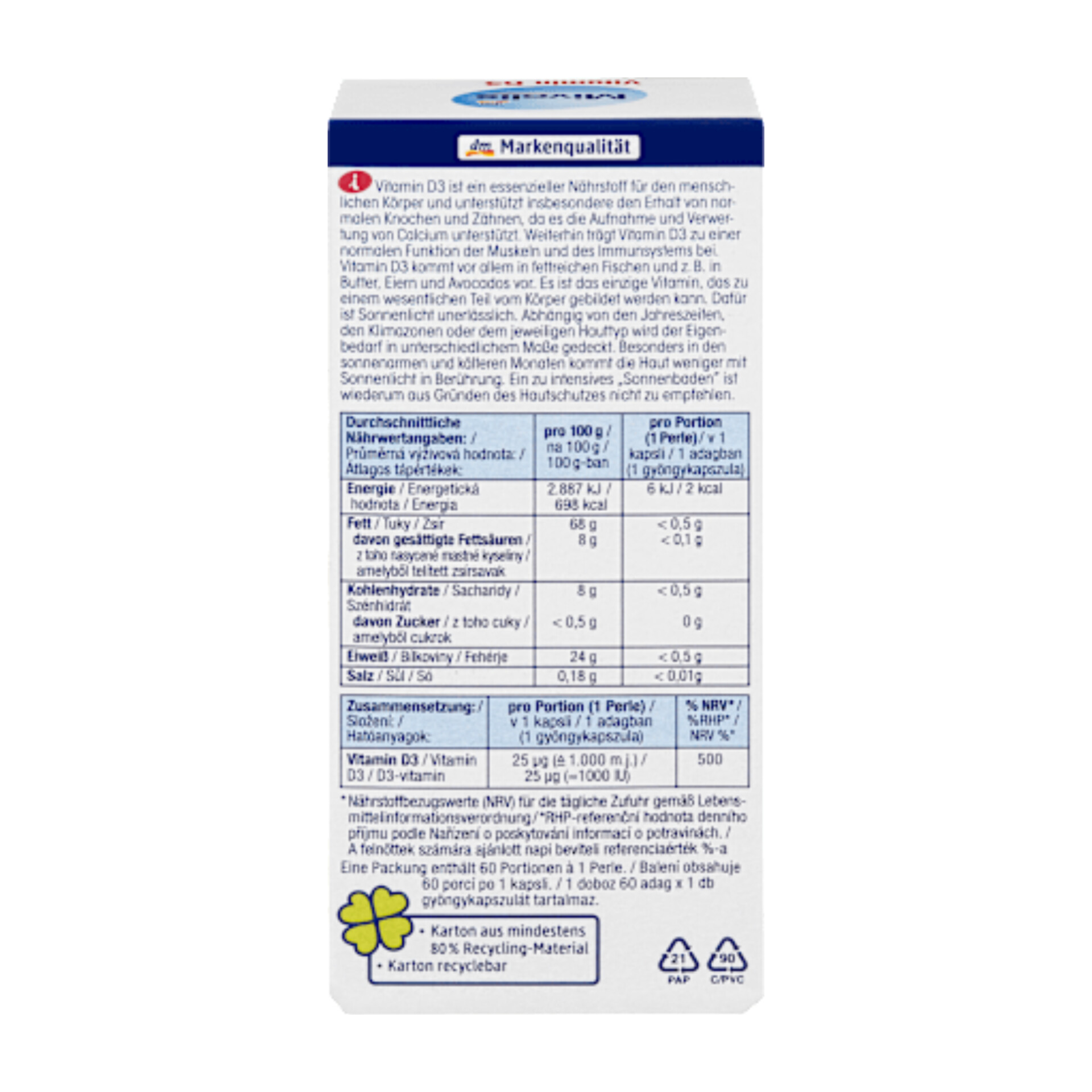 مرواریدهای ویتامین D3 میوولیس حاوی ویتامین D3 آفتاب هستند. ویتامین D3 یک ماده مغذی ضروری برای بدن انسان است و به ویژه میتواند از حفظ سلامت استخوانها و دندانها پشتیبانی کند، زیرا میتواند به جذب و استفاده از کلسیم کمک کند. علاوه بر این، ویتامین D3 میتواند به عملکرد طبیعی عضلات و سیستم ایمنی بدن کمک کند.
