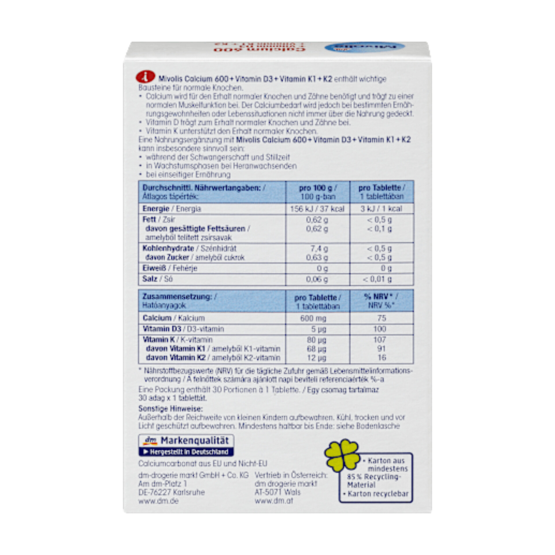متأسفانه، نیاز به کلسیم همیشه تنها از طریق رژیم غذایی برآورده نمیشود. برای رفع این عدم تعادل، قرصهای میوولیس کلسیم ۶۰۰، بلوکهای سازنده ضروری را فراهم میکنند. کلسیم، ویتامین D3 و ویتامین K به حفظ سلامت استخوانها و دندانها کمک میکنند. کلسیم همچنین میتواند از عملکرد عضلات پشتیبانی کند. علاوه بر این، این مکمل غذایی به ویژه در دوران بارداری و شیردهی، در دوران رشد ناگهانی در نوجوانان و در مواردی که رژیم غذایی محدود است، توصیه میشود.