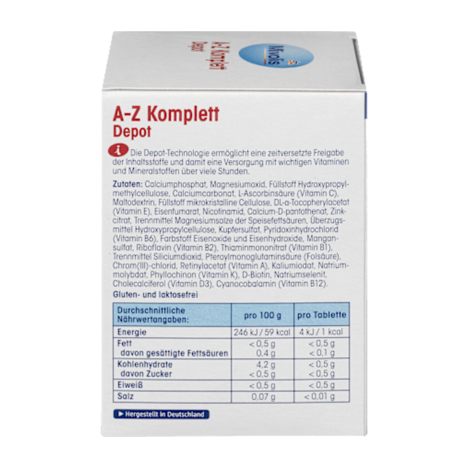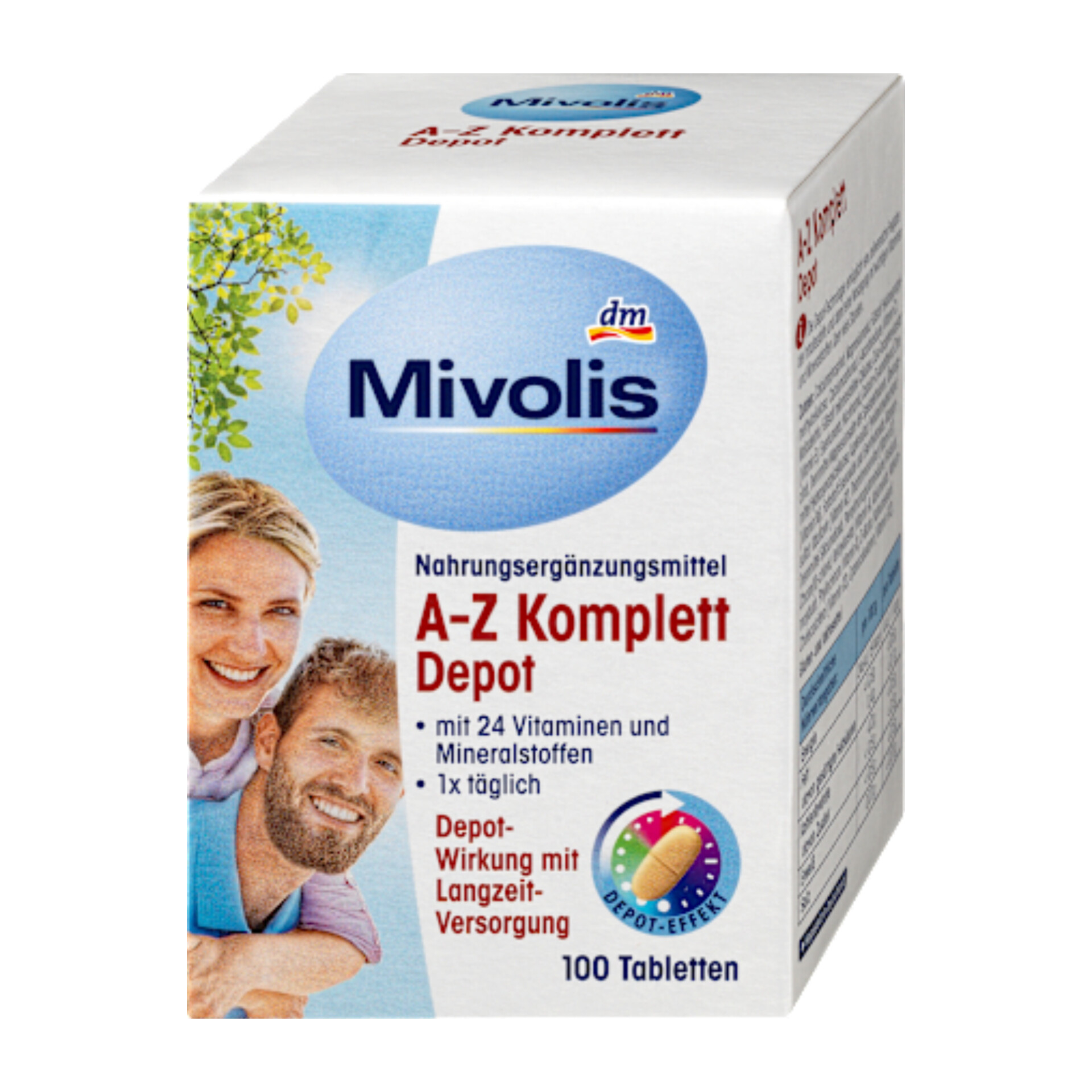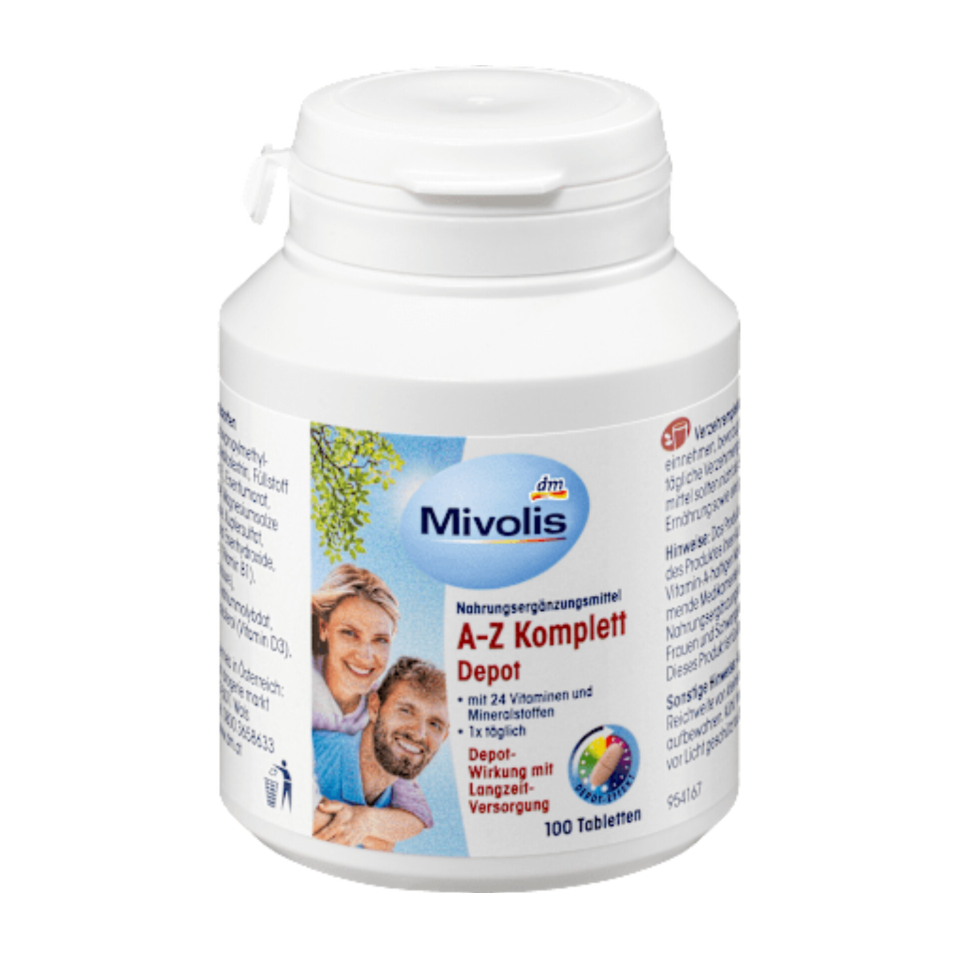 فناوری دپو در قرصهای Mivolis AZ Komplett Depot امکان آزادسازی تدریجی مواد تشکیلدهنده را فراهم میکند و در نتیجه ۲۴ ویتامین و ماده معدنی ضروری را برای ساعتهای متمادی تأمین میکند. این قرصها فاقد لاکتوز و گلوتن هستند.