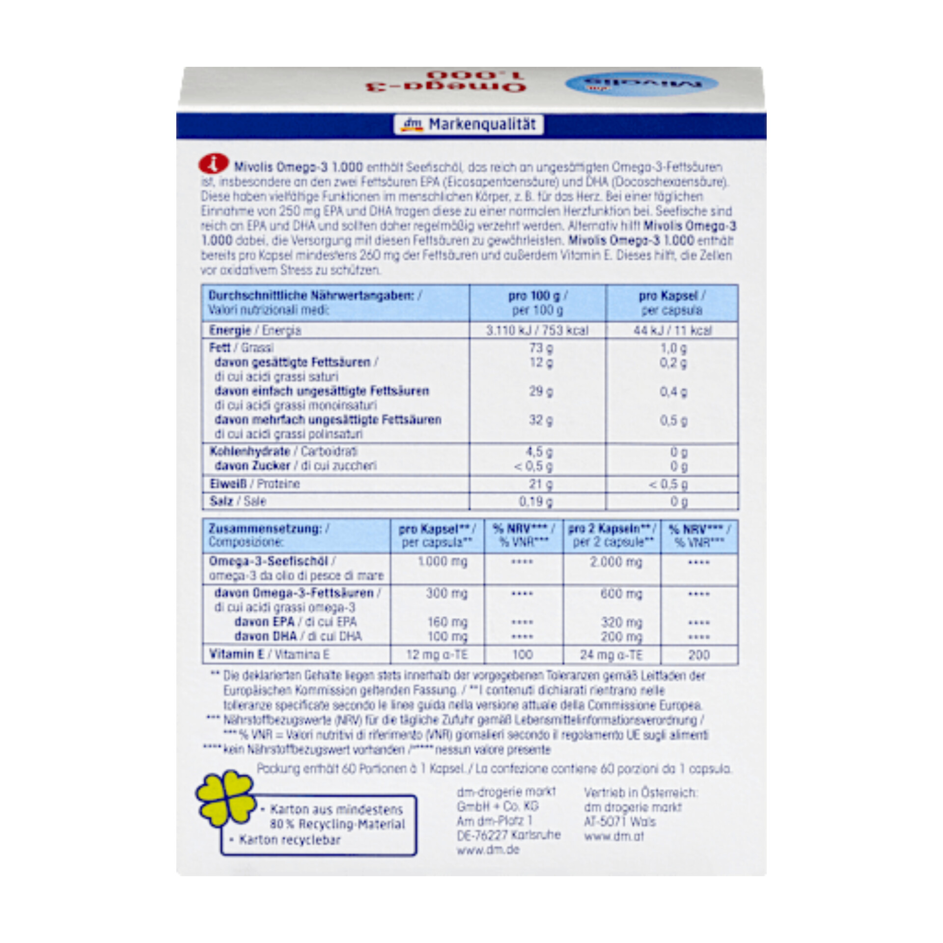 میوولیس امگا-۳ ۱۰۰۰ حاوی روغن ماهی دریایی است که سرشار از اسیدهای چرب امگا-۳ غیراشباع، به ویژه دو اسید چرب EPA (ایکوزاپنتانوئیک اسید) و DHA (دوکوزاهگزانوئیک اسید) است. این اسیدها عملکردهای متنوعی در بدن انسان دارند، به عنوان مثال، برای قلب. مصرف روزانه ۲۵۰ میلیگرم EPA و DHA به عملکرد طبیعی قلب کمک میکند. ماهیهای دریایی سرشار از EPA و DHA هستند و بنابراین باید به طور منظم مصرف شوند. از طرف دیگر، میوولیس امگا-۳ ۱۰۰۰ به تأمین کافی این اسیدهای چرب کمک میکند. هر کپسول میوولیس امگا-۳ ۱۰۰۰ حاوی حداقل ۲۶۰ میلیگرم از این اسیدهای چرب و همچنین ویتامین E است. این به محافظت از سلولها در برابر استرس اکسیداتیو کمک میکند.