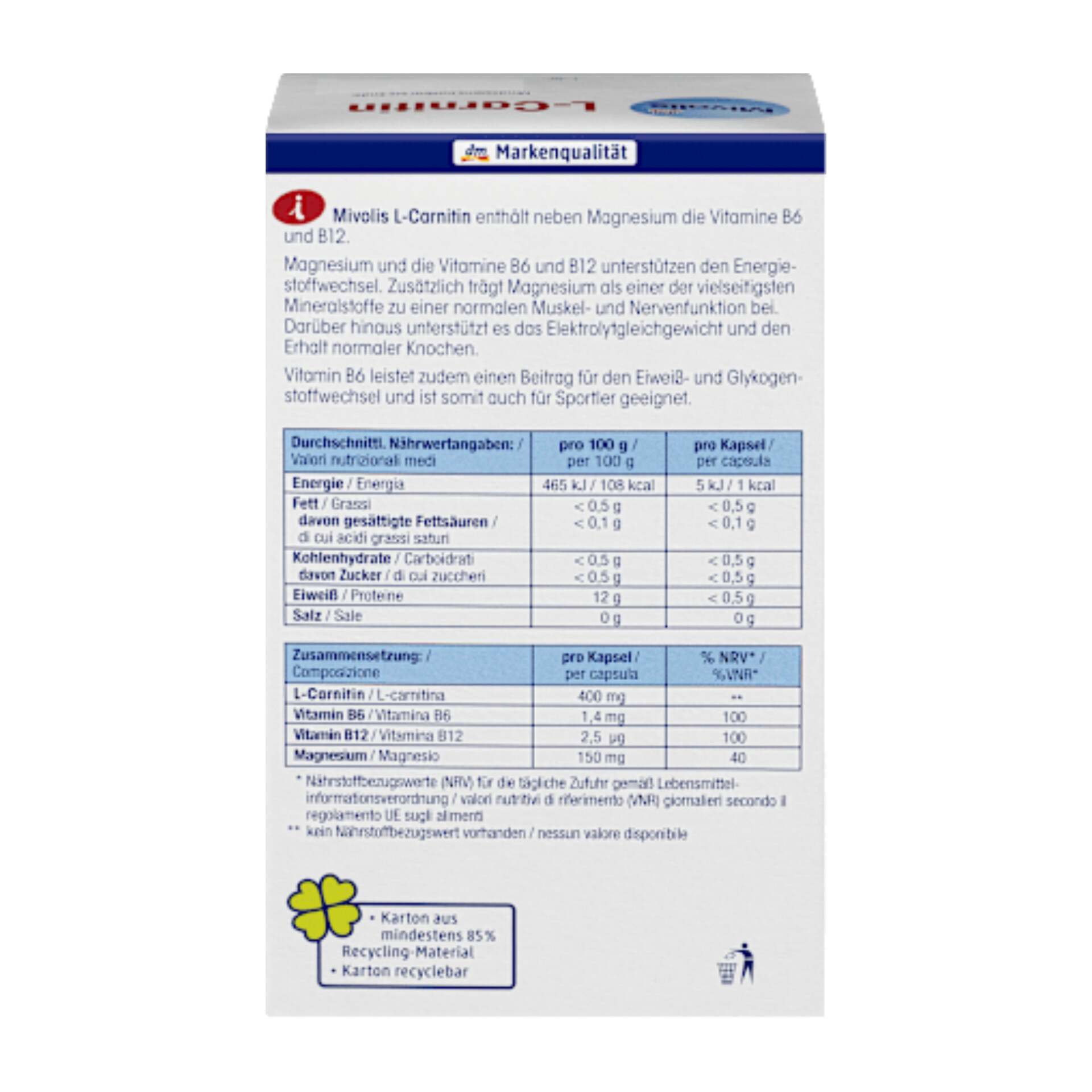 کپسولهای ال-کارنیتین میوولیس مکمل غذایی مناسبی برای ورزشکاران و افرادی است که نیازهای تغذیهای بالایی دارند. این کپسولها حاوی ال-کارنیتین، منیزیم، ویتامین B12 و ویتامین B6 هستند. آنها میتوانند به متابولیسم طبیعی انرژی کمک کرده و از حفظ طبیعی استخوانها پشتیبانی کنند. این کپسولها همچنین میتوانند از تعادل طبیعی الکترولیت و متابولیسم پروتئین و گلیکوژن پشتیبانی کنند. این مکمل غذایی بدون گلوتن و لاکتوز است.