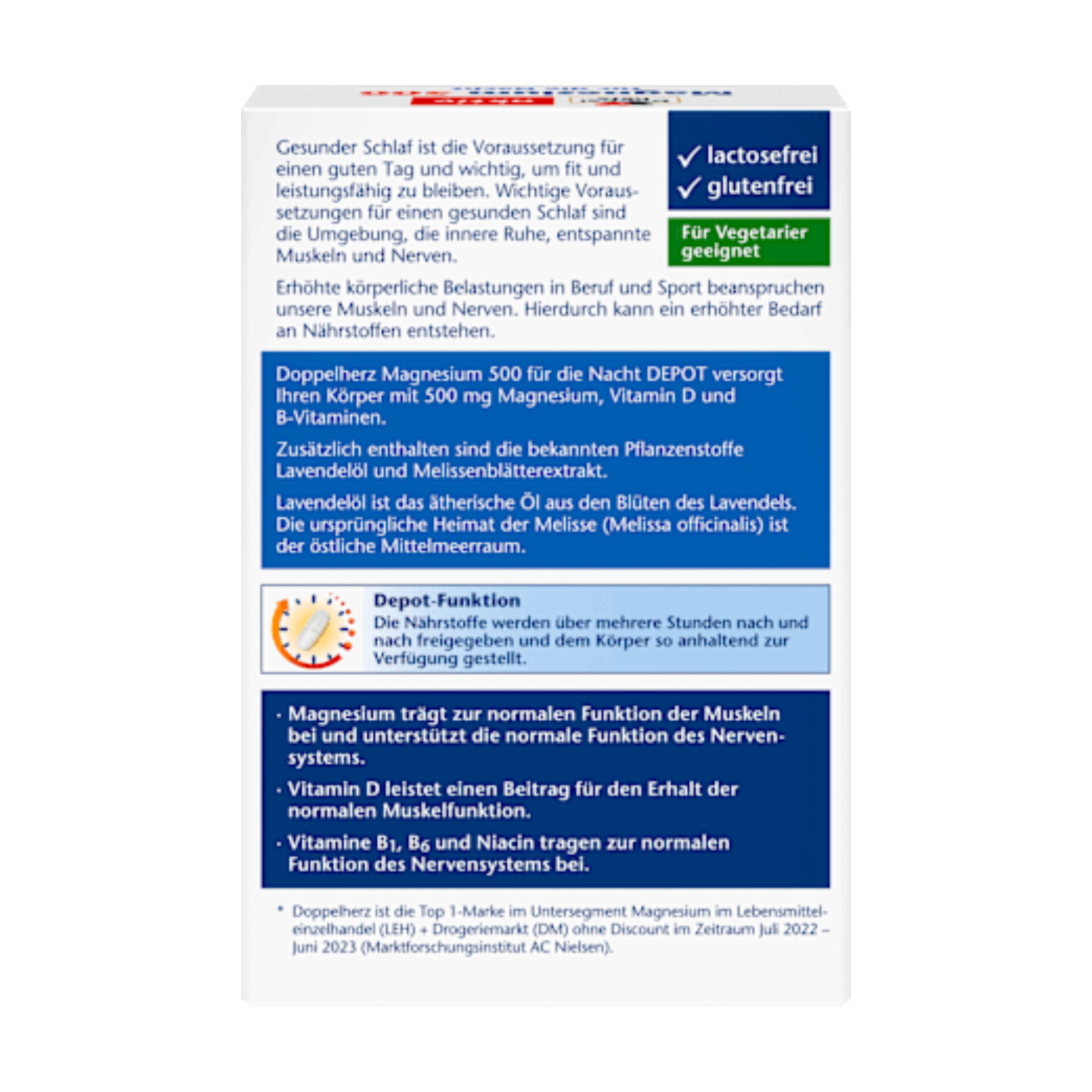 کپسولهای Doppelherz Magnesium 500 برای مصرف شبانه حاوی عصاره برگ بادرنجبویه و روغن اسطوخودوس هستند. این مکمل غذایی با دوز بالا همچنین حاوی ویتامین D و منیزیم است که از عملکرد طبیعی عضلات پشتیبانی میکنند. ویتامینهایی مانند B1، B6 و نیاسین به عملکرد طبیعی سیستم عصبی کمک میکنند. این کپسولها برای گیاهخواران مناسب هستند و همچنین فاقد لاکتوز و گلوتن میباشند.