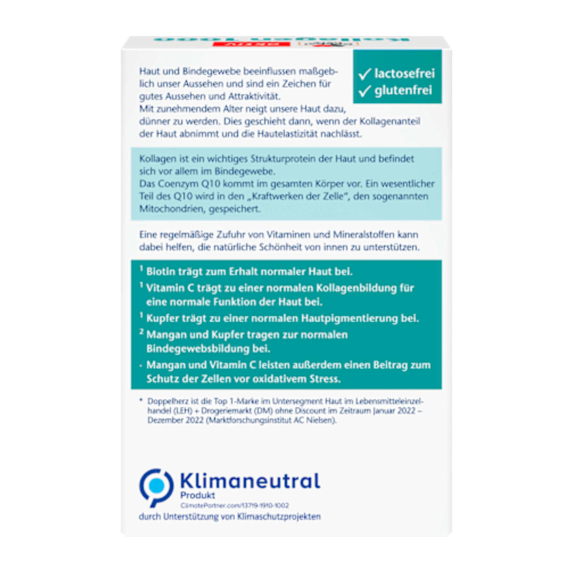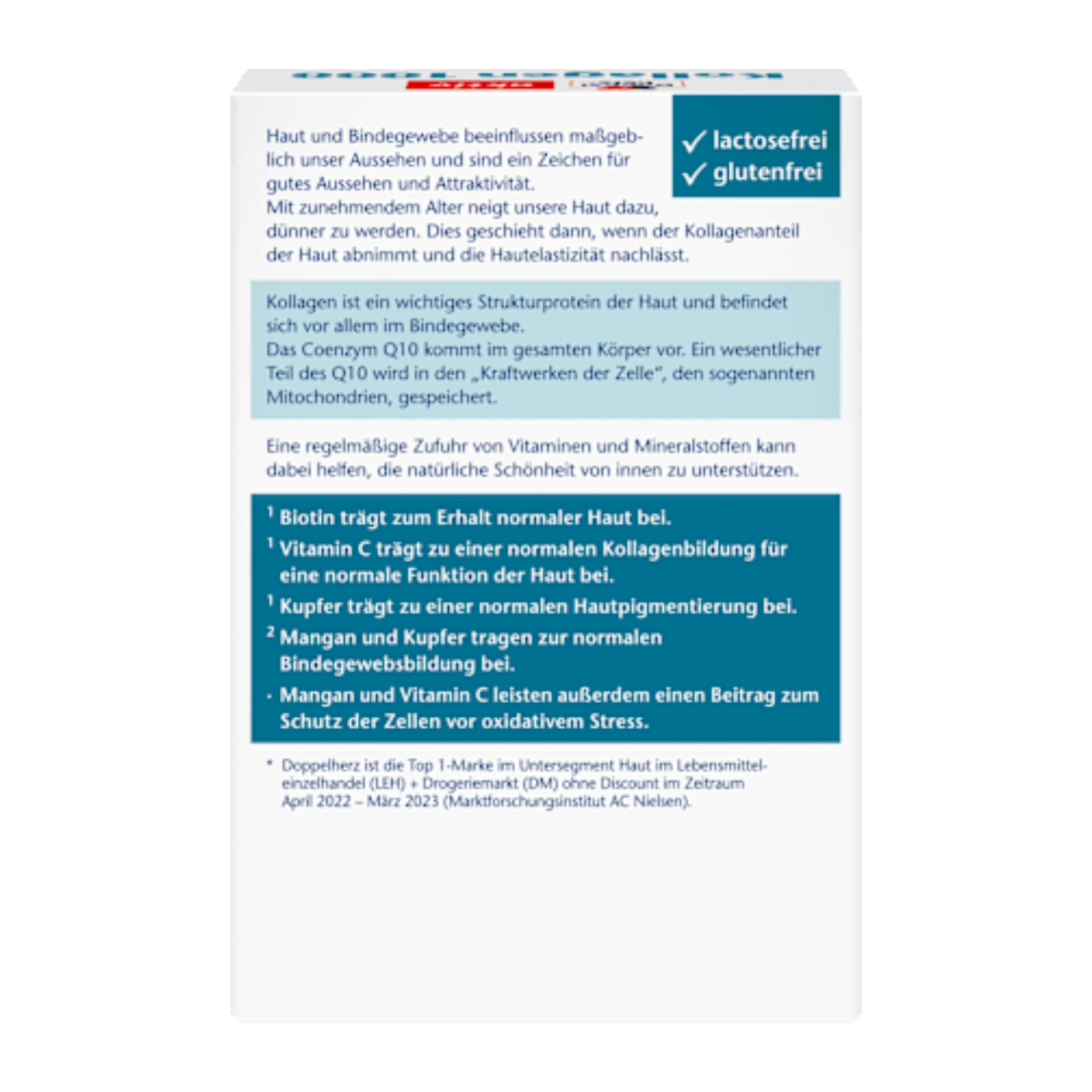 قرصهای کلاژن فعال ۱۰۰۰ شرکت Doppelherz با ۵۰۰ میکروگرم بیوتین و Q10، یک مکمل غذایی بدون لاکتوز و گلوتن هستند. بیوتین موجود در آنها میتواند به حفظ پوست طبیعی کمک کند. ویتامین C میتواند به تشکیل کلاژن طبیعی برای عملکرد طبیعی پوست کمک کند. مس میتواند به رنگدانهسازی طبیعی پوست کمک کند. منگنز و مس موجود در آنها میتوانند به تشکیل بافت همبند طبیعی کمک کنند. علاوه بر این، منگنز و ویتامین C میتوانند به محافظت از سلولها در برابر استرس اکسیداتیو کمک کنند.