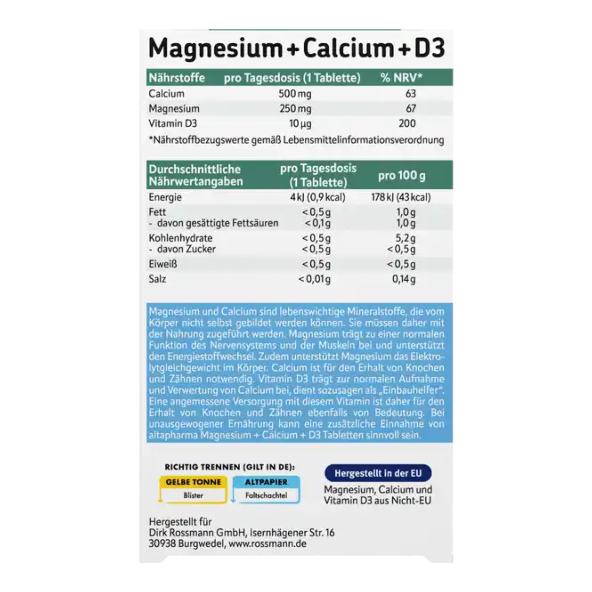 منیزیم و کلسیم مواد معدنی ضروری هستند که بدن نمیتواند خود آنها را تولید کند. بنابراین باید از طریق رژیم غذایی به دست آیند. منیزیم به عملکرد طبیعی سیستم عصبی و عضلات کمک میکند و از متابولیسم انرژی پشتیبانی میکند. همچنین به حفظ تعادل الکترولیت در بدن کمک میکند. کلسیم برای حفظ سلامت استخوانها و دندانها ضروری است. ویتامین D3 به جذب و استفاده طبیعی کلسیم کمک میکند و اساساً به عنوان یک "سودآور" عمل میکند. بنابراین، مصرف کافی این ویتامین برای حفظ سلامت استخوانها و دندانها نیز مهم است. در مواردی که رژیم غذایی نامتعادلی دارید، مصرف قرصهای Altapharma Magnesium + Calcium + D3 ممکن است مفید باشد.