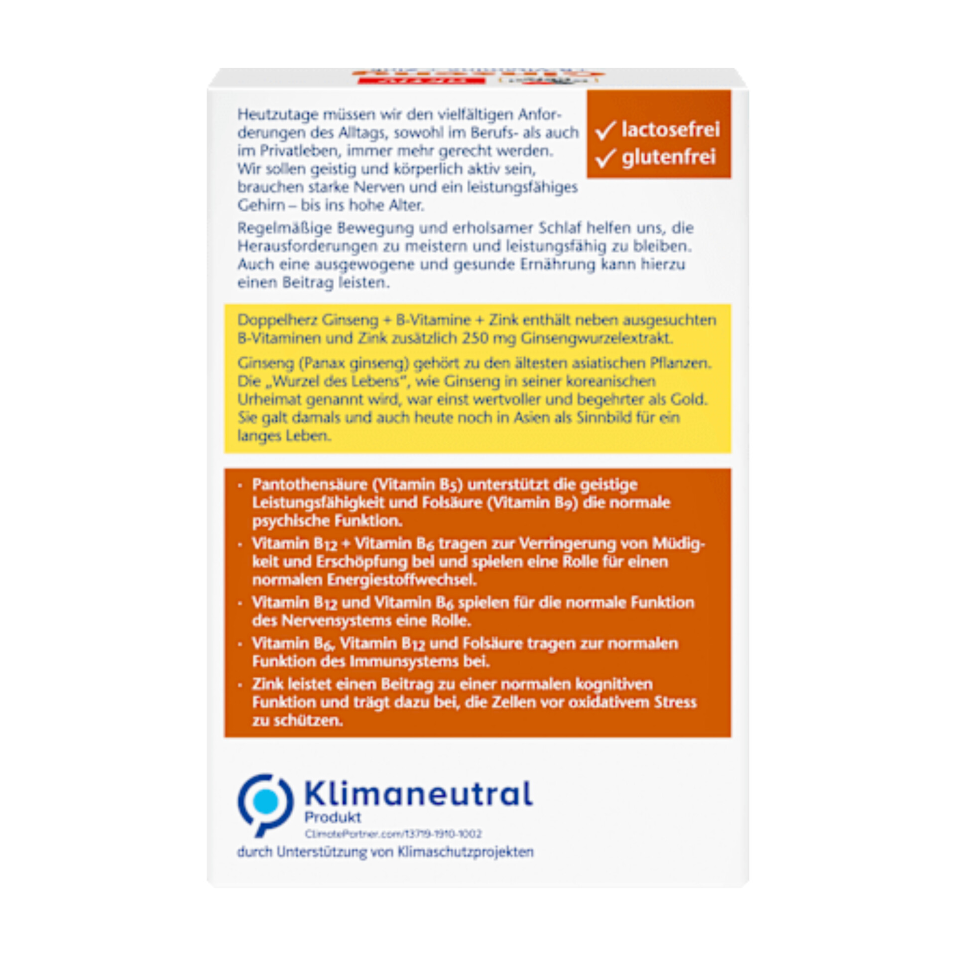 کپسولهای جینسینگ دوپلهرز ۲۵۰ عددی حاوی ویتامینهای B6 و B12 هستند که به کاهش خستگی و کوفتگی کمک کرده و در متابولیسم طبیعی انرژی نقش دارند. اسید پانتوتنیک (ویتامین B5) از عملکرد ذهنی پشتیبانی میکند و اسید فولیک (ویتامین B9) از عملکرد طبیعی روانی پشتیبانی میکند.