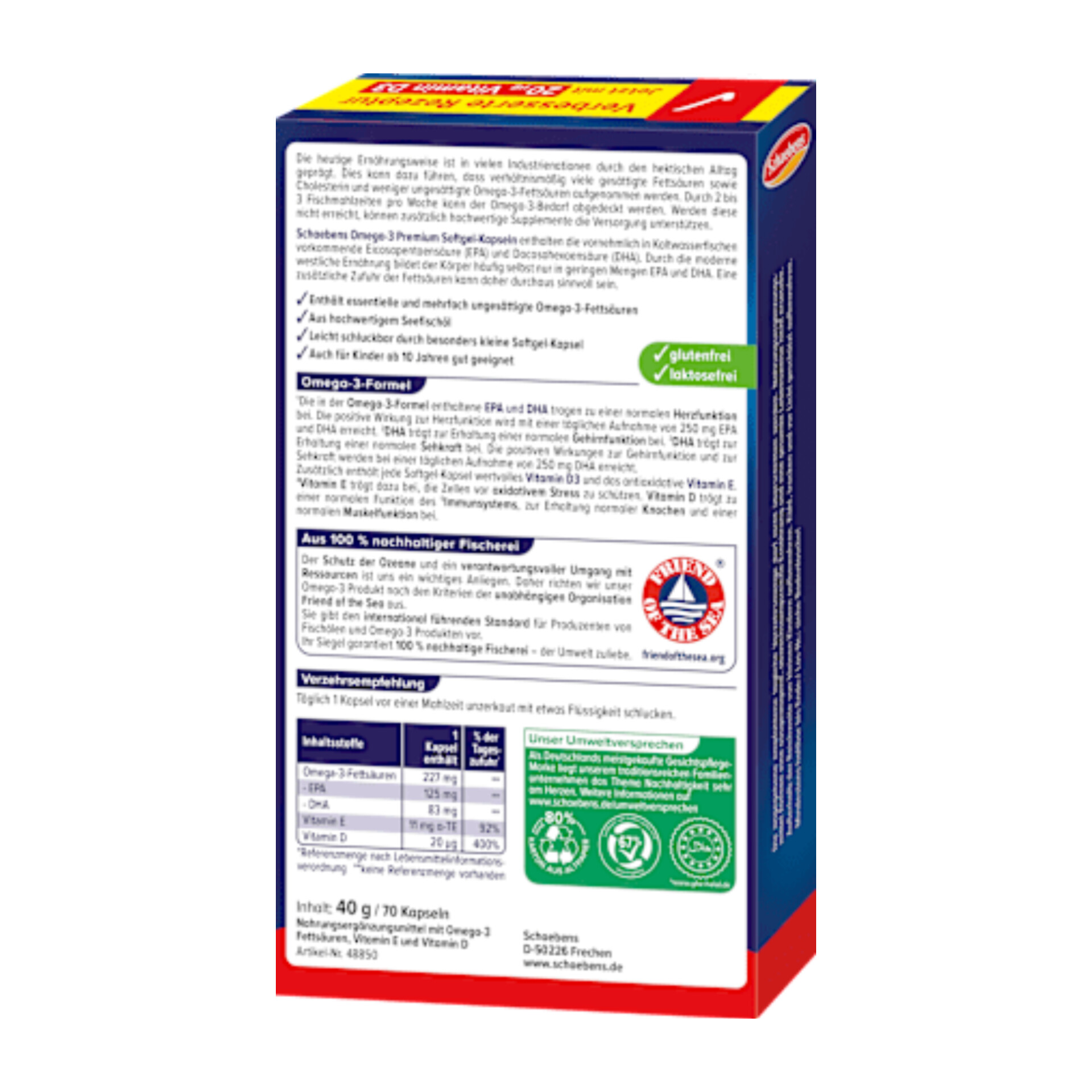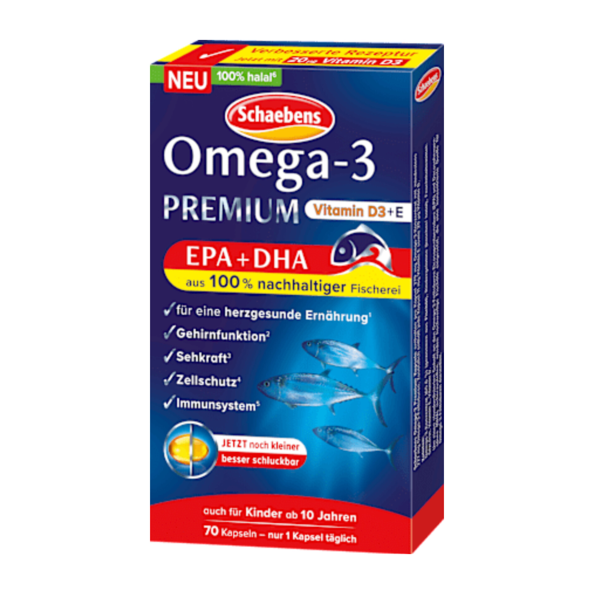 کپسولهای روغن ماهی پریمیوم امگا ۳ Schaebens منبع غلیظی از اسیدهای چرب امگا ۳ مانند EPA و DHA را ارائه میدهند که میتوانند به عملکرد طبیعی قلب کمک کنند*. این کپسولها به راحتی در زندگی روزمره جای میگیرند و مکملی ایدهآل برای یک رژیم غذایی متعادل هستند. با ۷۰ کپسول در هر بسته، این کپسولها یک راه حل مناسب برای دریافت روزانه اسیدهای چرب ضروری شما ارائه میدهند. *با مصرف روزانه ۲۵۰ میلیگرم EPA و DHA، اثر مفیدی خواهید داشت.