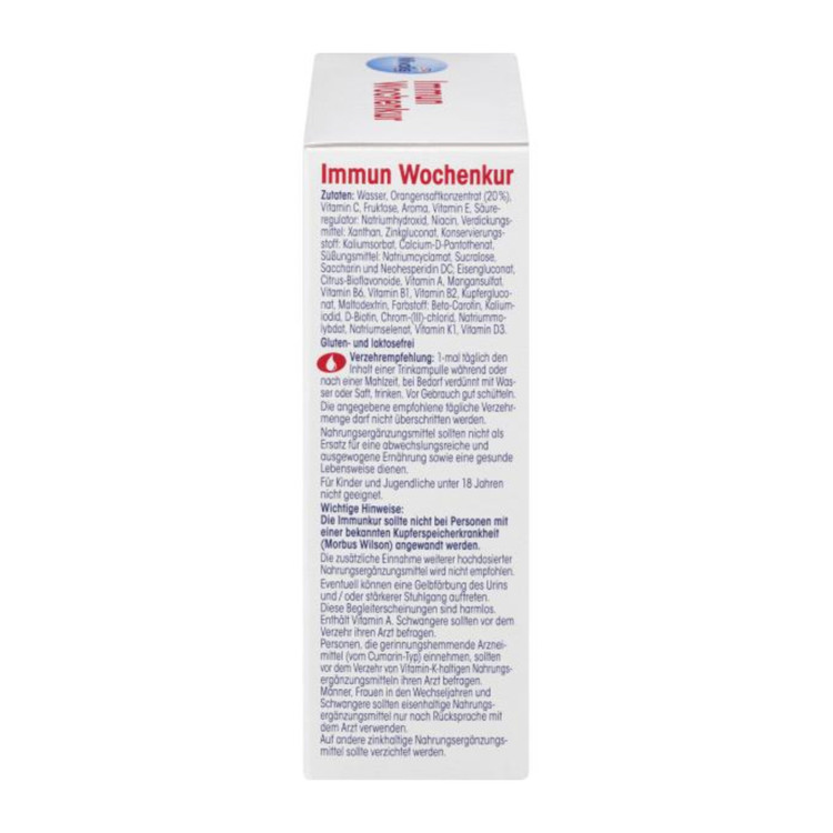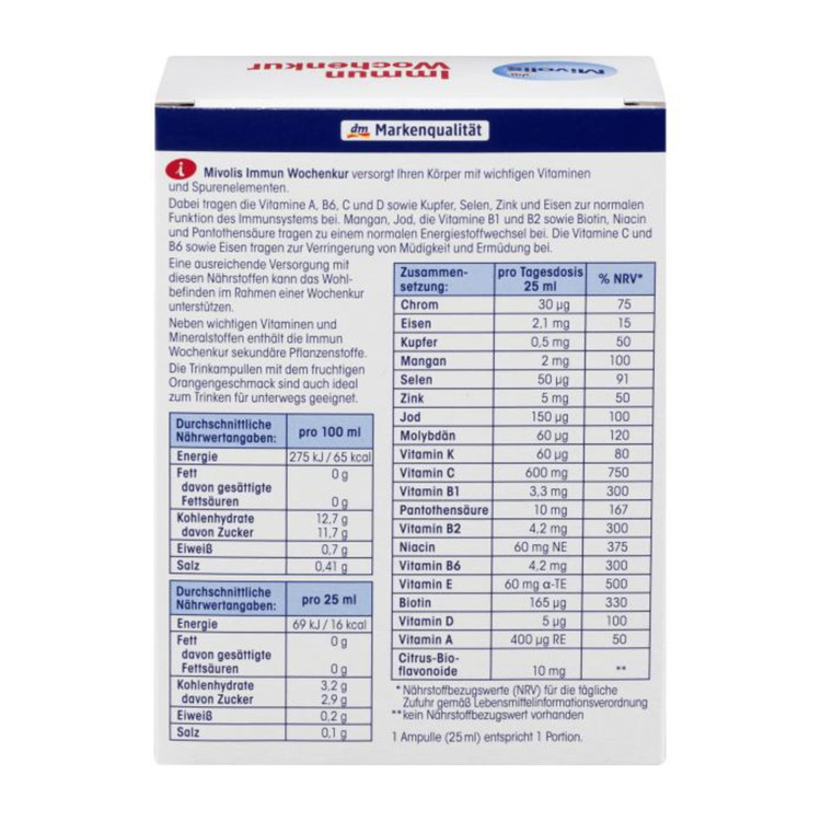 درمان هفتگی ایمنی میوولیس ویتامینها و عناصر کمیاب ضروری را برای بدن شما فراهم میکند. ویتامینهای A، B6، C و D و همچنین مس، سلنیوم، روی و آهن به عملکرد طبیعی سیستم ایمنی بدن کمک میکنند. منگنز، ید، ویتامینهای B1 و B2، بیوتین، نیاسین و اسید پانتوتنیک به متابولیسم طبیعی انرژی کمک میکنند. ویتامینهای C و B6 به همراه آهن به کاهش خستگی و کوفتگی کمک میکنند. تأمین کافی این مواد مغذی میتواند در طول درمان هفتگی از سلامت شما پشتیبانی کند. علاوه بر ویتامینها و مواد معدنی مهم، درمان هفتگی ایمنی حاوی ترکیبات گیاهی ثانویه است. آمپولهای قابل نوشیدن با طعم پرتقال میوهای خود برای مصرف در حال حرکت نیز ایدهآل هستند.