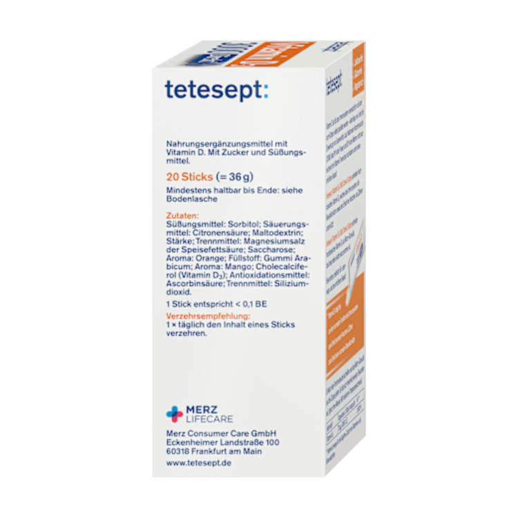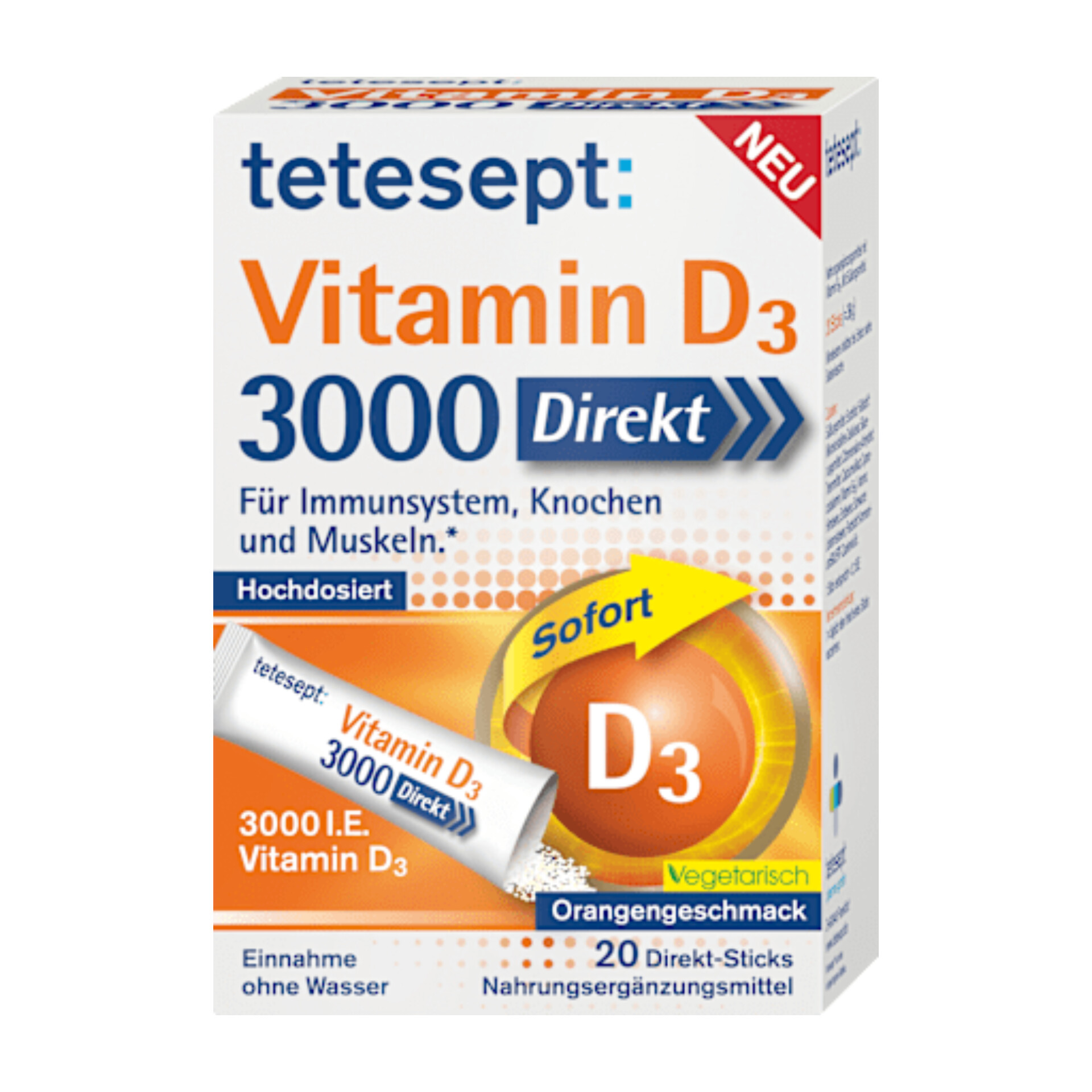 استیکهای ویتامین D3 3000 Direct بدون گلوتن و لاکتوز از برند tetesept، دوز بالایی از ویتامین D3 را به شکل پودر ارائه میدهند. این پودر با طعم پرتقال میوهای، میتواند مستقیماً روی زبان مصرف شود - سریع، دلپذیر و بدون نیاز به آب.
