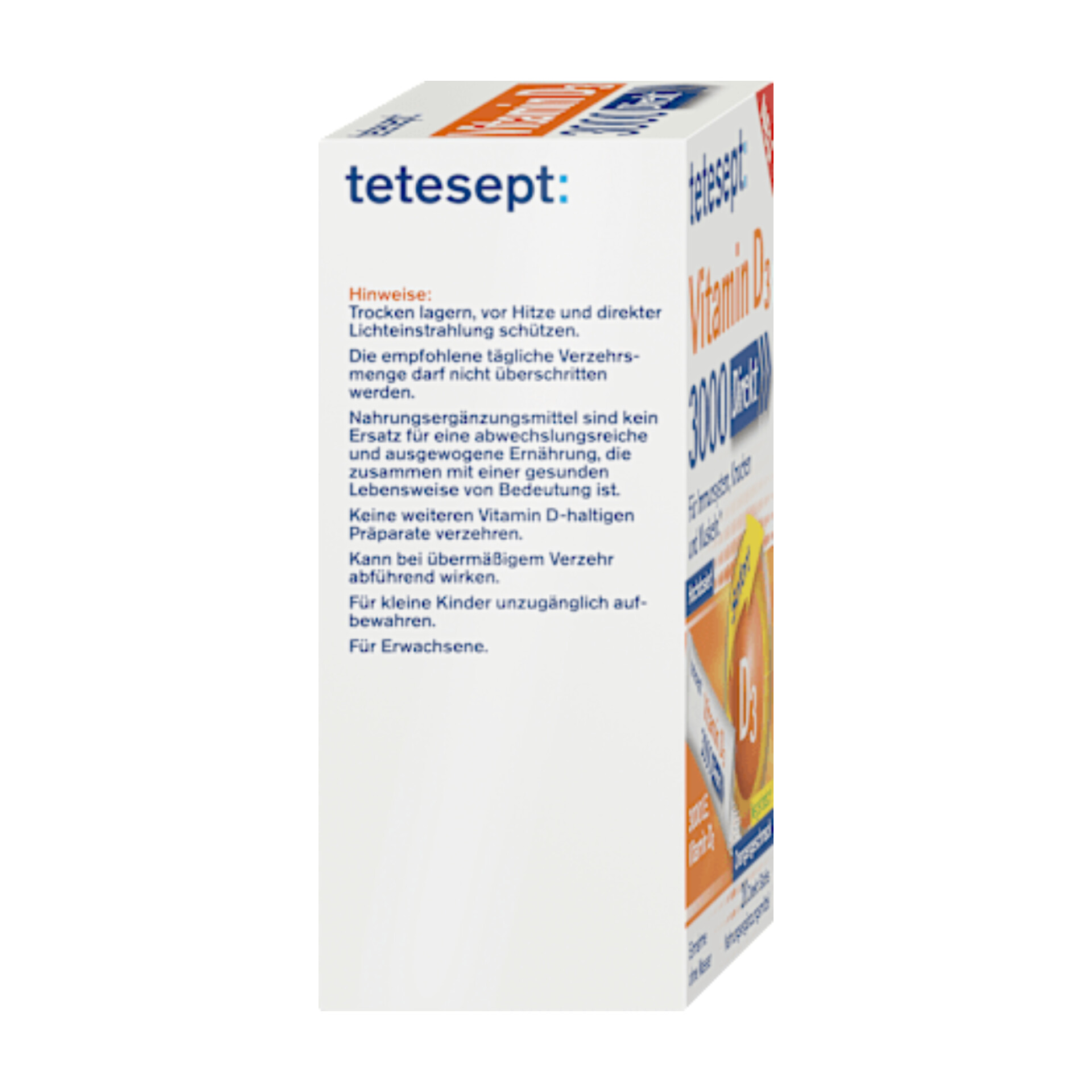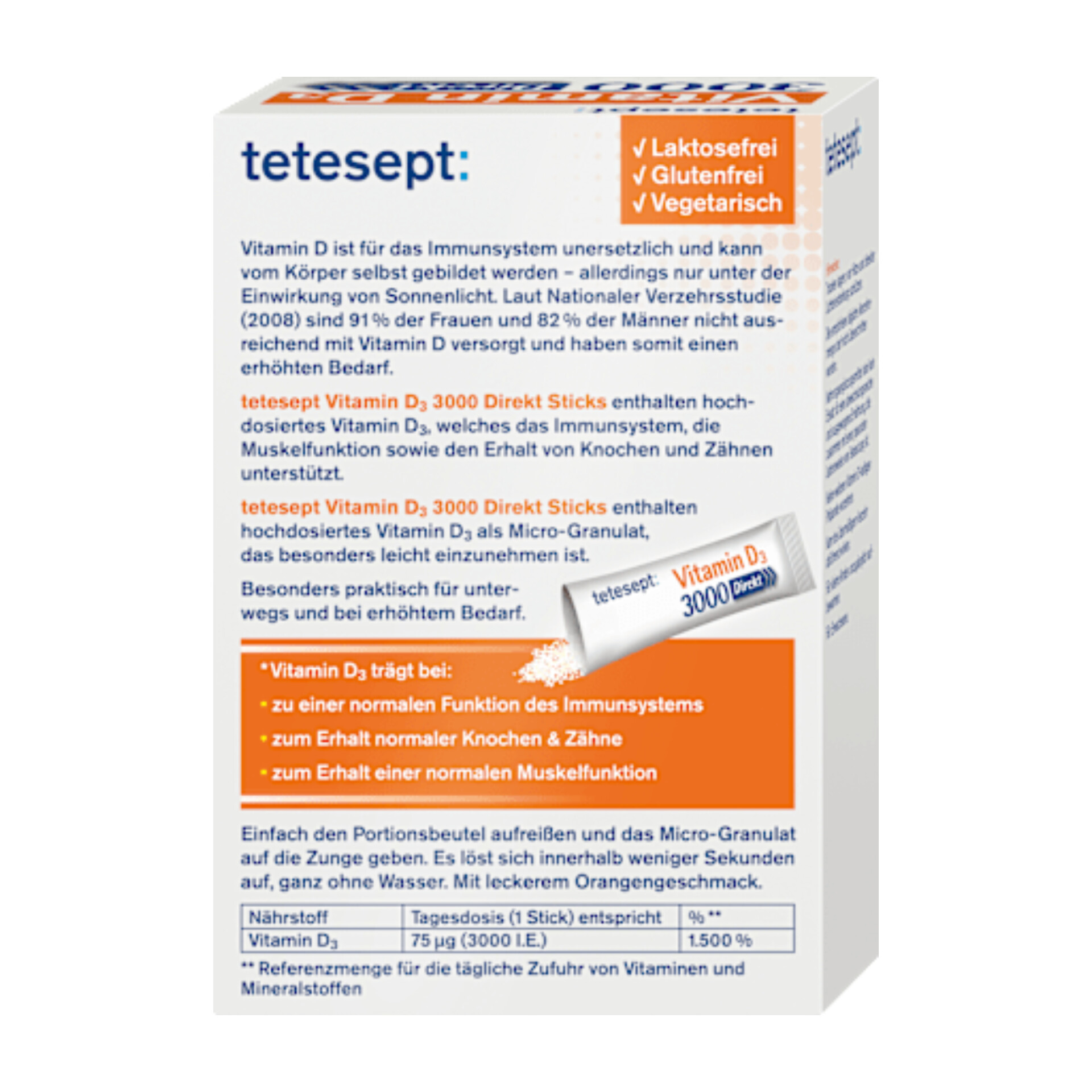 استیکهای ویتامین D3 3000 Direct بدون گلوتن و لاکتوز از برند tetesept، دوز بالایی از ویتامین D3 را به شکل پودر ارائه میدهند. این پودر با طعم پرتقال میوهای، میتواند مستقیماً روی زبان مصرف شود - سریع، دلپذیر و بدون نیاز به آب.