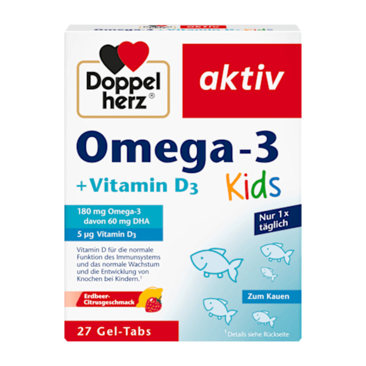 قرصهای جویدنی کودکان Doppelherz Omega-3 + Vitamin D3 روشی ساده و خوشمزه برای تأمین اسیدهای چرب امگا 3 و ویتامین D مورد نیاز کودکان ارائه میدهند. ویتامین D همچنین میتواند از سیستم ایمنی سالم و سلامت استخوانها پشتیبانی کند. این قرصهای ژلهای با طعم خوشمزه توت فرنگی-مرکبات، برای کودکانی که زیاد ماهی نمیخورند ایدهآل هستند و طعم خنک آنها به خصوص خوب است.