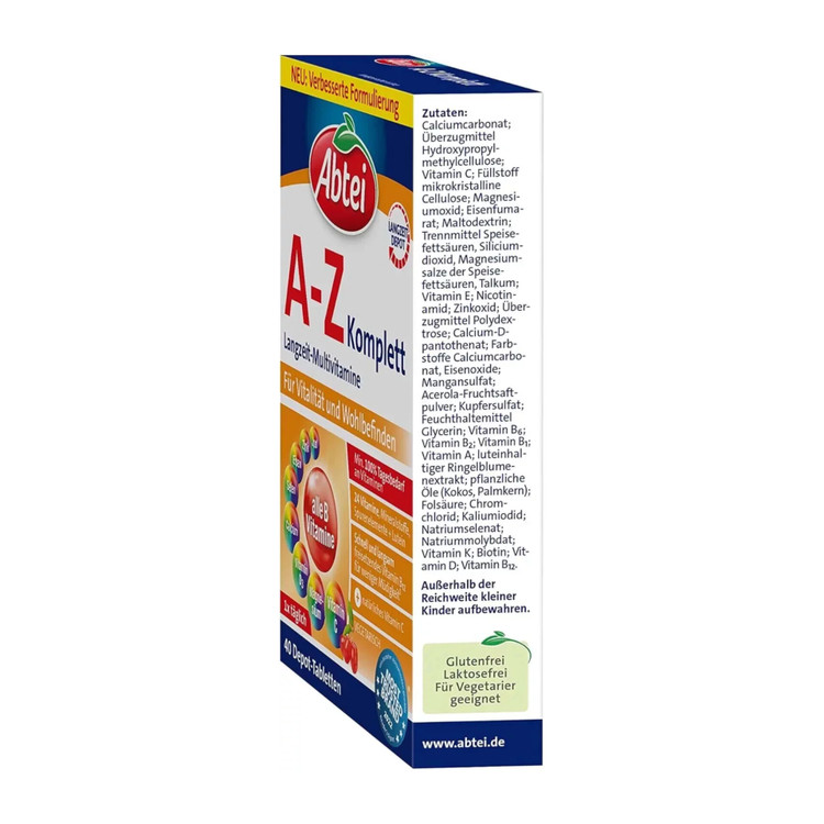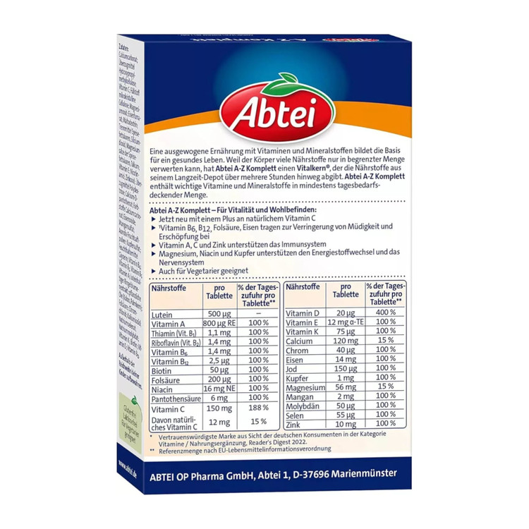 یک رژیم غذایی متعادل سرشار از ویتامینها و مواد معدنی، اساس یک زندگی سالم را تشکیل میدهد. از آنجا که بدن فقط میتواند از بسیاری از مواد مغذی در مقادیر محدود استفاده کند، Abtei AZ Komplett دارای یک Vitalkern® (هسته حیاتی) است که مواد مغذی را از انبار ذخیره طولانی مدت خود طی چند ساعت آزاد میکند. Abtei AZ Komplett حاوی ویتامینها و مواد معدنی ضروری در مقادیر کافی برای تأمین نیاز روزانه است.