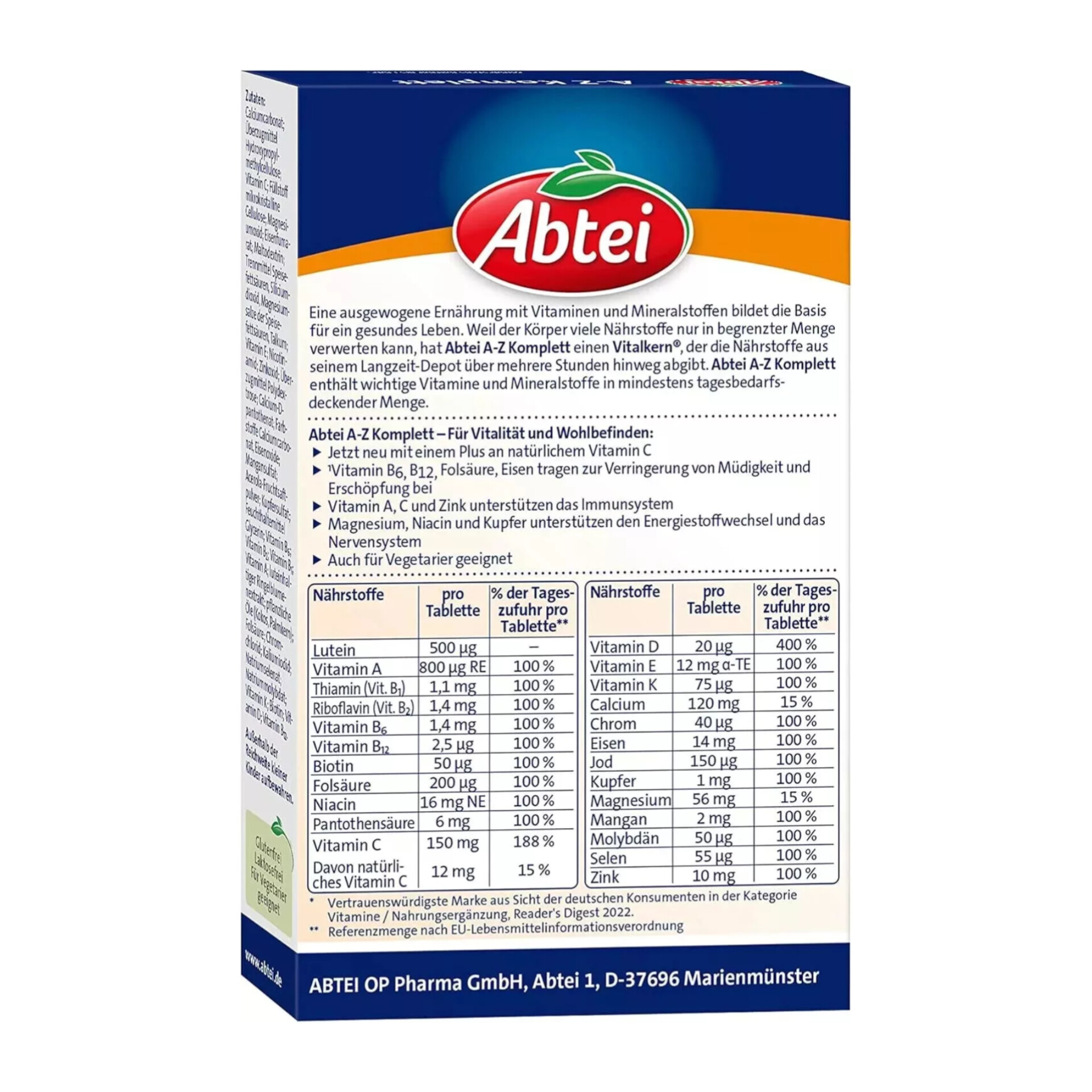 یک رژیم غذایی متعادل سرشار از ویتامینها و مواد معدنی، اساس یک زندگی سالم را تشکیل میدهد. از آنجا که بدن فقط میتواند از بسیاری از مواد مغذی در مقادیر محدود استفاده کند، Abtei AZ Komplett دارای یک Vitalkern® (هسته حیاتی) است که مواد مغذی را از انبار ذخیره طولانی مدت خود طی چند ساعت آزاد میکند. Abtei AZ Komplett حاوی ویتامینها و مواد معدنی ضروری در مقادیر کافی برای تأمین نیاز روزانه است.