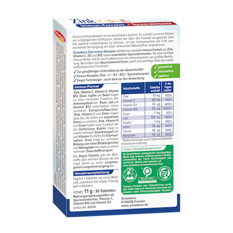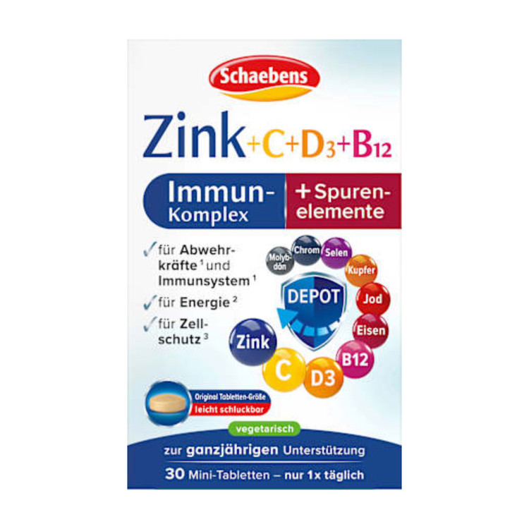 مکمل تقویت سیستم ایمنی Schaebens’ Zinc + C + D3 + B12 حاوی ترکیبی ویژه از ویتامینها و عناصر کمیاب است. به لطف اثر منحصر به فرد دپو، مواد مؤثر آن در مدت زمان طولانی در بدن آزاد میشوند، به این معنی که فقط به یک قرص در روز نیاز است. این مکمل با دارا بودن روی و ویتامینهای C، D3 و B12، در تمام طول سال از عملکرد طبیعی سیستم ایمنی پشتیبانی میکند.