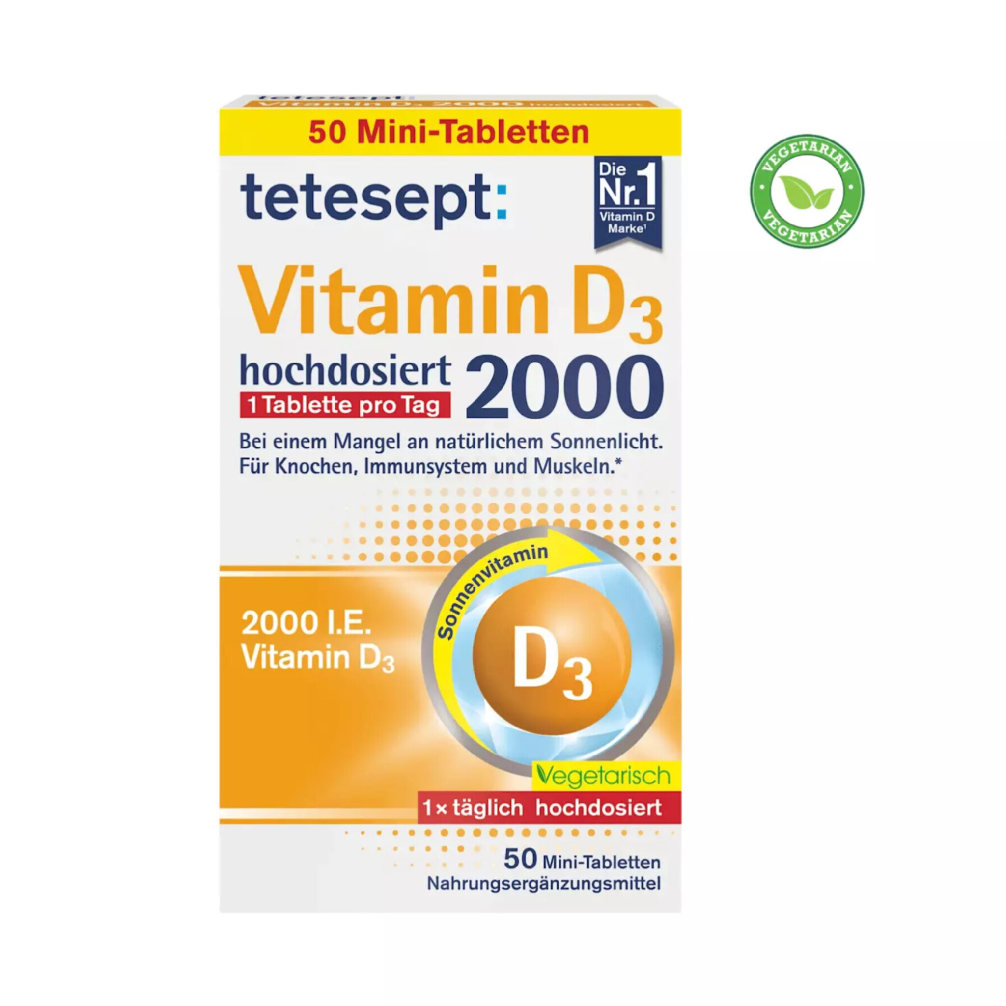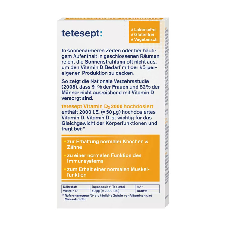 حاوی ۲۰۰۰ واحد بینالمللی (= ۵۰ میکروگرم) ویتامین D3 با دوز بالا برای عملکرد طبیعی سیستم ایمنی و حفظ عملکرد طبیعی عضلات و همچنین سلامت استخوانها و دندانها.