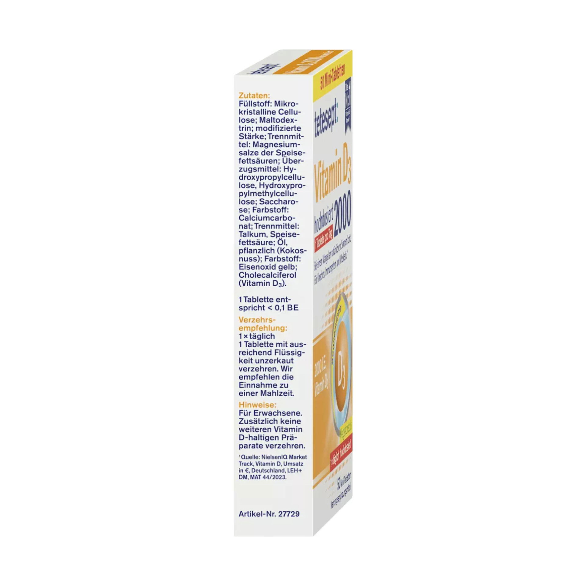 حاوی ۲۰۰۰ واحد بینالمللی (= ۵۰ میکروگرم) ویتامین D3 با دوز بالا برای عملکرد طبیعی سیستم ایمنی و حفظ عملکرد طبیعی عضلات و همچنین سلامت استخوانها و دندانها.