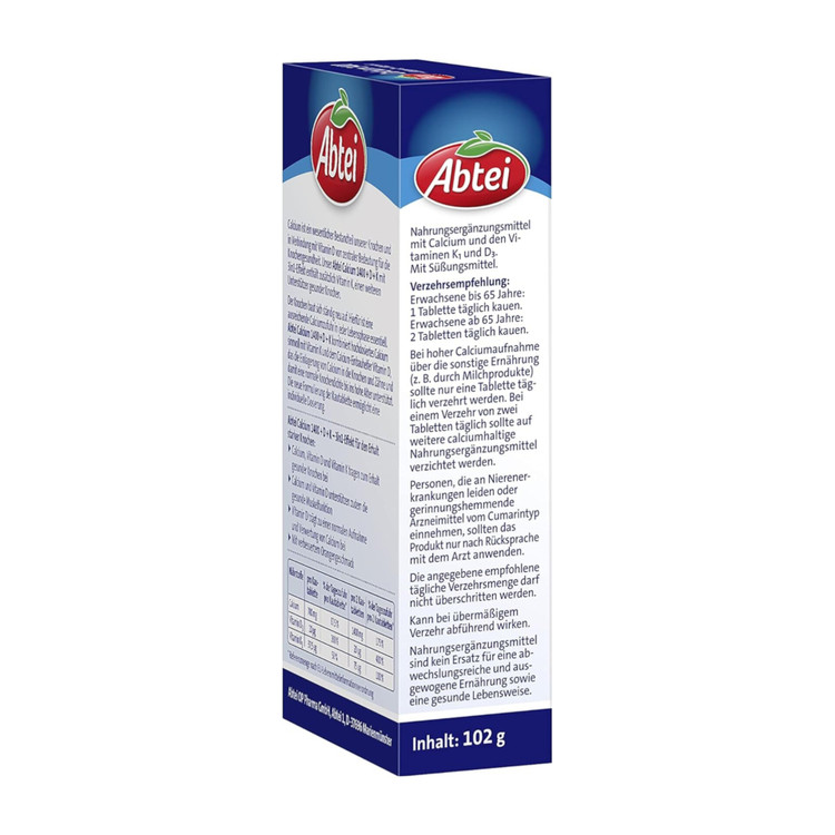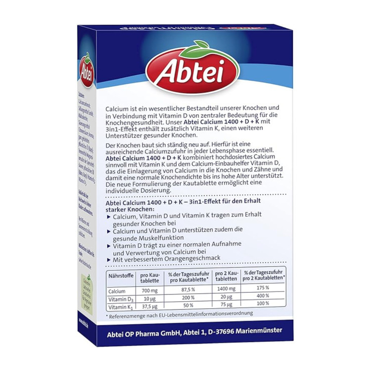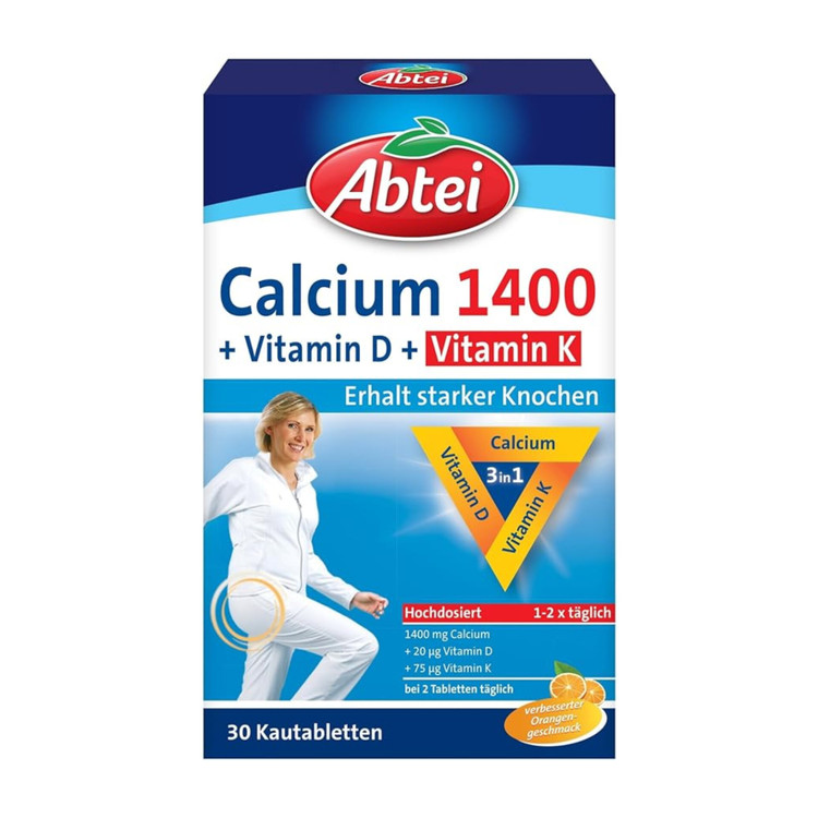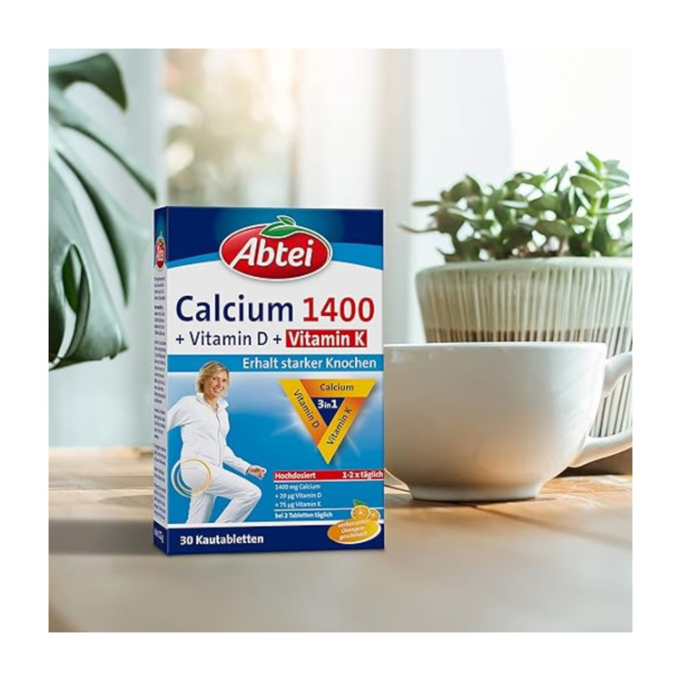 دوز بالا: حاوی ۱۴۰۰ میلیگرم کلسیم با دو قرص روزانه. پتاسیم Abtei با ۲۰ میکروگرم ویتامین D و ۷۵ میکروگرم ویتامین K، مواد مغذی با کیفیت بالا را برای بدن فراهم میکند.