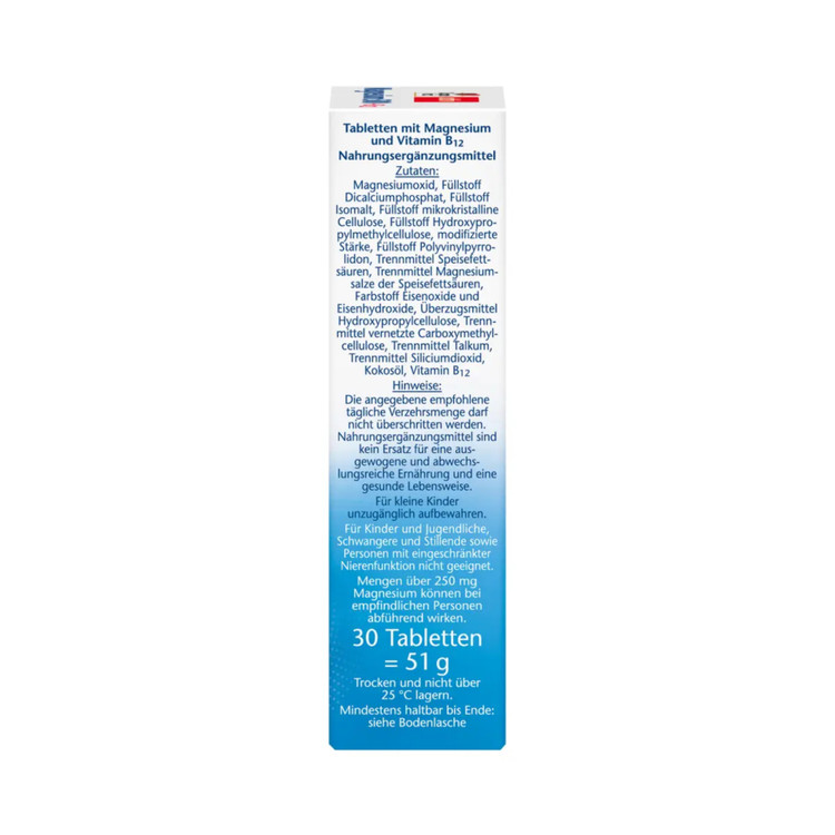 قرصهای دو فاز منیزیم ۵۰۰ + ویتامین B12 از شرکت Doppelherz حاوی ۵۰٪ منیزیم و ویتامین B12 از فاز رهایش فوری و ۵۰٪ منیزیم و ویتامین B12 از فاز ذخیره هستند. منیزیم یک ماده معدنی ضروری است که بدن نمیتواند خودش آن را تولید کند و فقط میتواند به میزان محدودی ذخیره شود. غذاهای حیوانی منبع عالی ویتامین B12 هستند، در حالی که غذاهای گیاهی معمولاً فقط حاوی مقادیر کمی هستند. افزایش فشار فیزیکی در کار و ورزش، عضلات و اعصاب را تحت فشار قرار میدهد و منجر به نیاز بیشتر به منیزیم و ویتامین B12 میشود. منیزیم به عملکرد طبیعی عضلات و حفظ سلامت استخوانها کمک میکند. منیزیم و ویتامین B12 از متابولیسم طبیعی انرژی پشتیبانی میکنند. ویتامین B12 به عملکرد طبیعی سیستم عصبی کمک میکند و به کاهش خستگی و کوفتگی کمک میکند.
