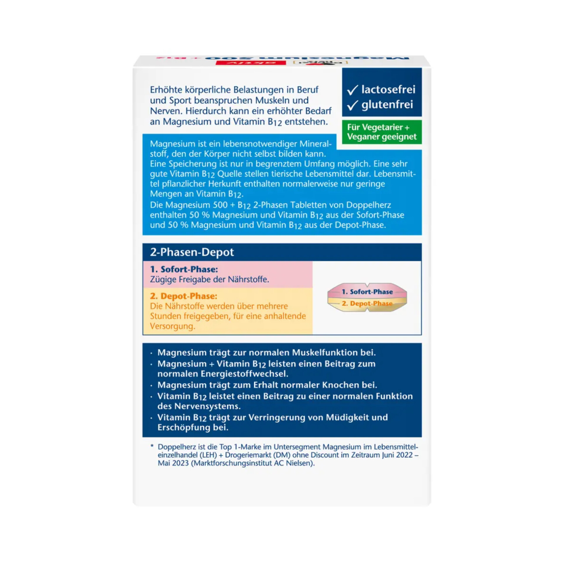 قرصهای دو فاز منیزیم ۵۰۰ + ویتامین B12 از شرکت Doppelherz حاوی ۵۰٪ منیزیم و ویتامین B12 از فاز رهایش فوری و ۵۰٪ منیزیم و ویتامین B12 از فاز ذخیره هستند. منیزیم یک ماده معدنی ضروری است که بدن نمیتواند خودش آن را تولید کند و فقط میتواند به میزان محدودی ذخیره شود. غذاهای حیوانی منبع عالی ویتامین B12 هستند، در حالی که غذاهای گیاهی معمولاً فقط حاوی مقادیر کمی هستند. افزایش فشار فیزیکی در کار و ورزش، عضلات و اعصاب را تحت فشار قرار میدهد و منجر به نیاز بیشتر به منیزیم و ویتامین B12 میشود. منیزیم به عملکرد طبیعی عضلات و حفظ سلامت استخوانها کمک میکند. منیزیم و ویتامین B12 از متابولیسم طبیعی انرژی پشتیبانی میکنند. ویتامین B12 به عملکرد طبیعی سیستم عصبی کمک میکند و به کاهش خستگی و کوفتگی کمک میکند.