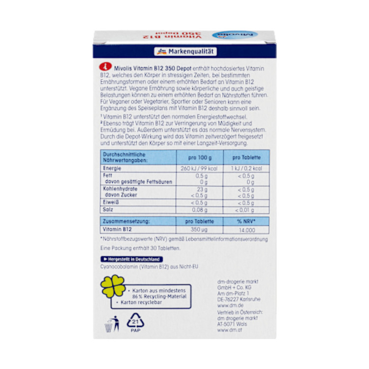 نیازهای ویتامینی شما را در طول روز پوشش میدهد. این قرصهای ویتامین B12 350 Depot بسیار غلیظ هستند و به لطف اثر Depot خود، پشتیبانی طولانیمدتی را ارائه میدهند. این مکمل گیاهی به طور ویژه در اندازه بسیار کوچک برای بلع آسان فرموله شده است. ویتامین B12 همچنین میتواند به کاهش خستگی و کوفتگی کمک کند.