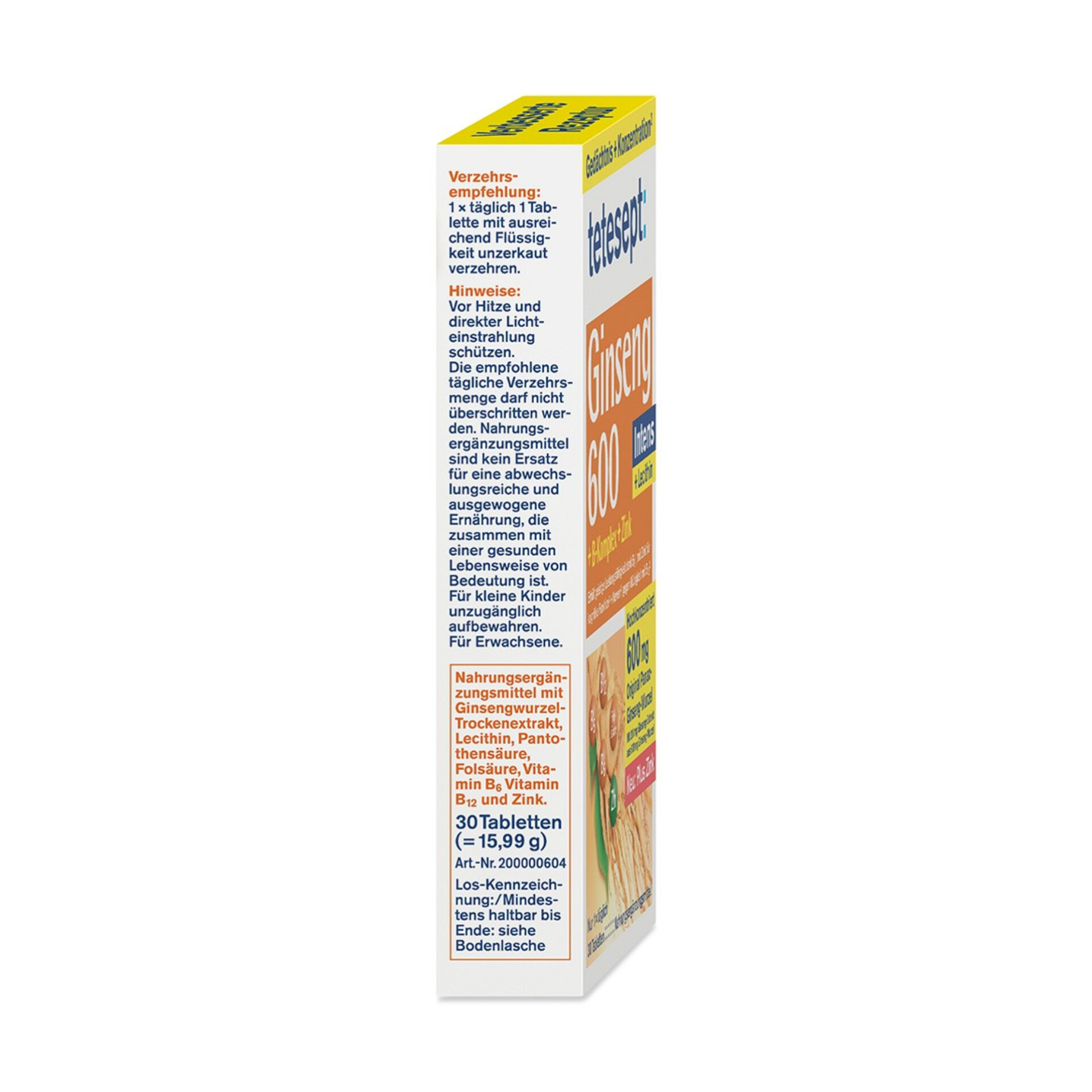 جینسینگ پاناکس اصلی و با کیفیت بالا با منشأ شرق آسیا، در فلسفه تغذیه سنتی آسیا به عنوان نمادی از هماهنگی و تعادل در بدن در نظر گرفته میشود. ⁵ tetesept Ginseng 600 Intens حاوی 200 میلیگرم عصاره جینسینگ از 600 میلیگرم ریشه جینسینگ است.