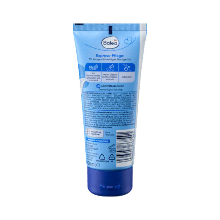 پس از شستشو و ضدعفونی مکرر دستها، دستان شما قدر مراقبت بیشتری را میدانند. کرم دست گیاهی Balea با فرمولی غنی از عصاره بامبو و کره شی باتر، رطوبت زیادی را برای شما فراهم میکند. پوست خشک به طور قابل توجهی نرمتر شده و از کمآبی محافظت میشود. این کرم پوست شما را نرم و مخملی میکند، فاقد میکروپلاستیک است و برای استفاده در حال حرکت ایدهآل است. رایحهای تابستانی، تجربه مراقبت از پوست را تکمیل میکند.