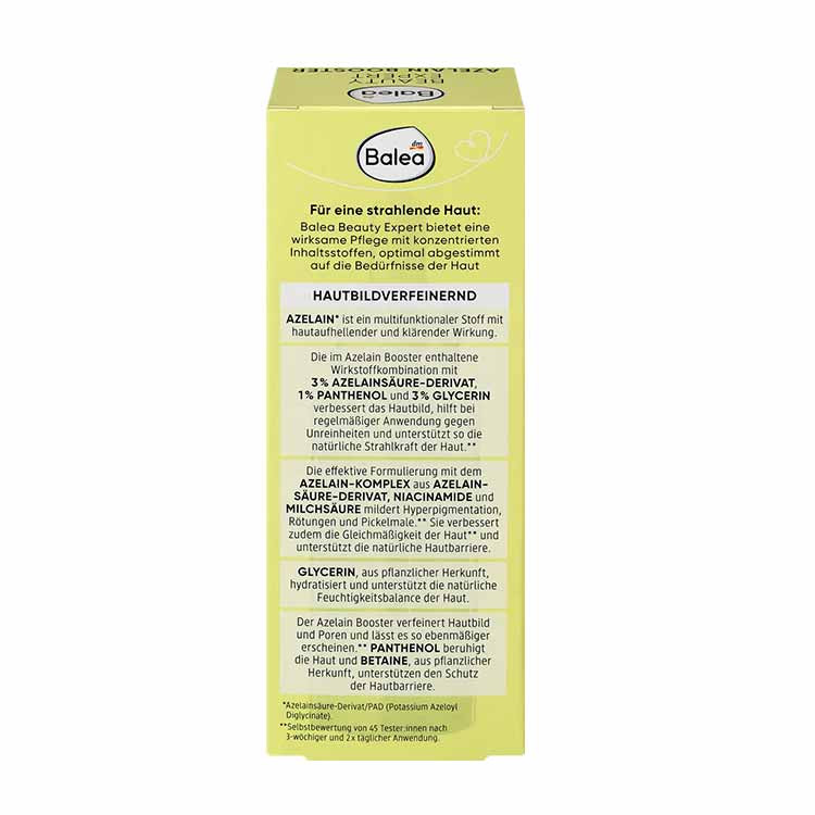 فرمول مراقبتی مؤثر تقویتکننده زیبایی Balea Expert با ترکیبات غلیظ کار میکند. آزلاین و پانتنول پوست شما را تغذیه میکنند و به شما چهرهای درخشان و زیبا میدهند. این فرمول همچنین ۱۰۰ درصد گیاهی و کاملاً بدون عطر است. با استفاده منظم، این سرم میتواند به از بین بردن آلودگیهای صورت نیز کمک کند.