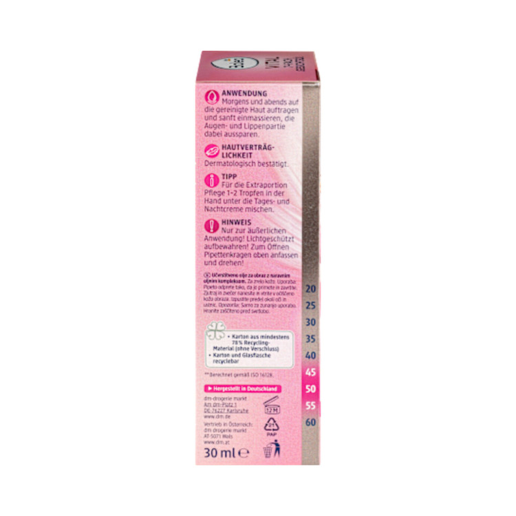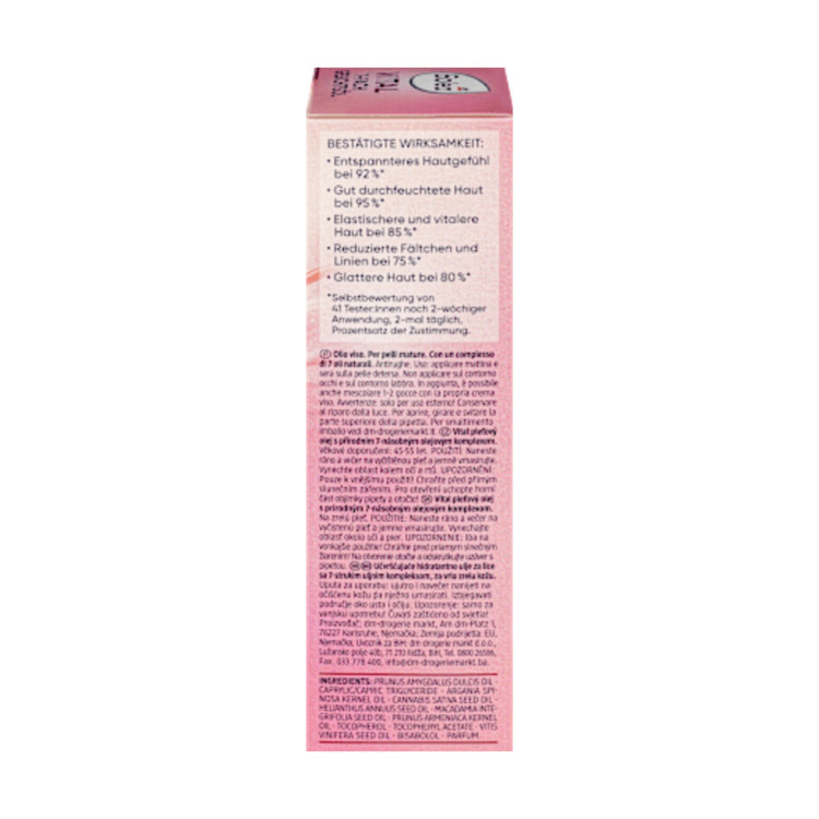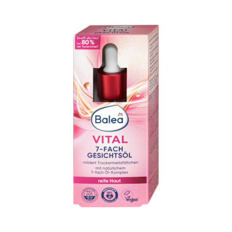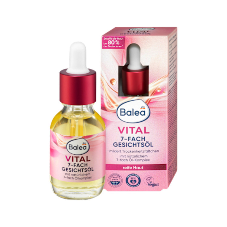 روغن صورت ۷ لایه Balea VITAL راه حلی عالی برای پوستی زیبا، مراقبت شده، شاداب و احیا شده است. این روغن سرشار از آنتی اکسیدان های طبیعی و ویتامین E است. لیپیدهای گیاهی از عملکرد طبیعی پوست پشتیبانی می کنند، مراقبت های ویژه ای ارائه می دهند و به بهبودی پوست کمک می کنند. خطوط ریز و سفتی ناشی از خشکی کاهش می یابد. ترکیب روغن گیاهی ۷ لایه شامل روغن آرگان ارگانیک، بادام، ماکادمیا، هسته زردآلو، شاهدانه، هسته انگور و روغن آفتابگردان سرشار از اسیدهای چرب امگا ۳ و امگا ۶ است و با محافظت از پوست در برابر کم آبی، علائم استرس روزمره را کاهش می دهد.